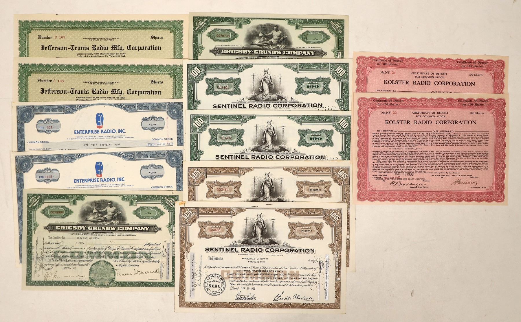 Issued, 2 each. Brown and green 1955 Sentinel Radio, 1932 Grigsby Grundy, 1981 Enterprise Radio. Unissued-Jefferson-Travis Radio Mfg., 1930 Kloster Radio.