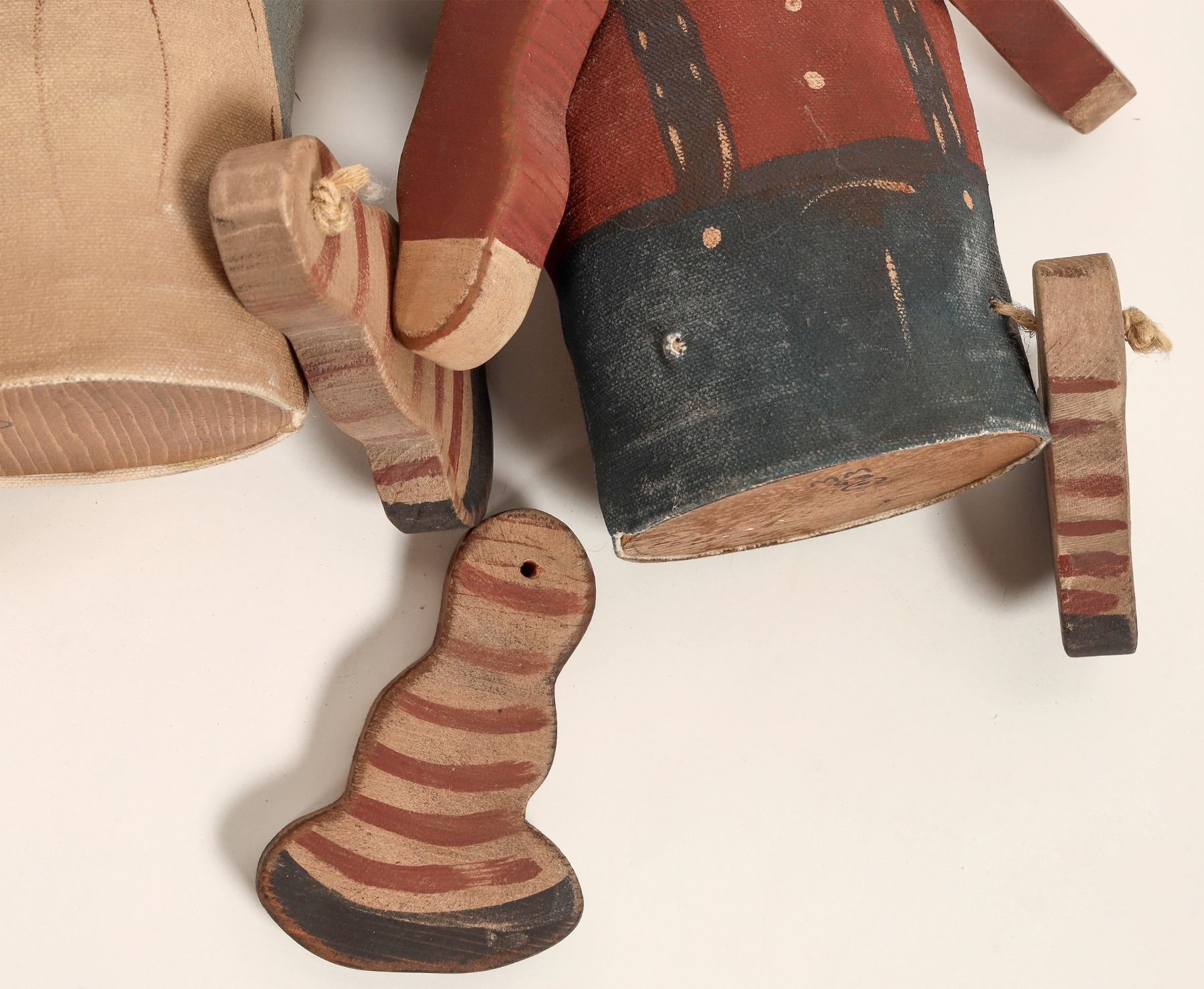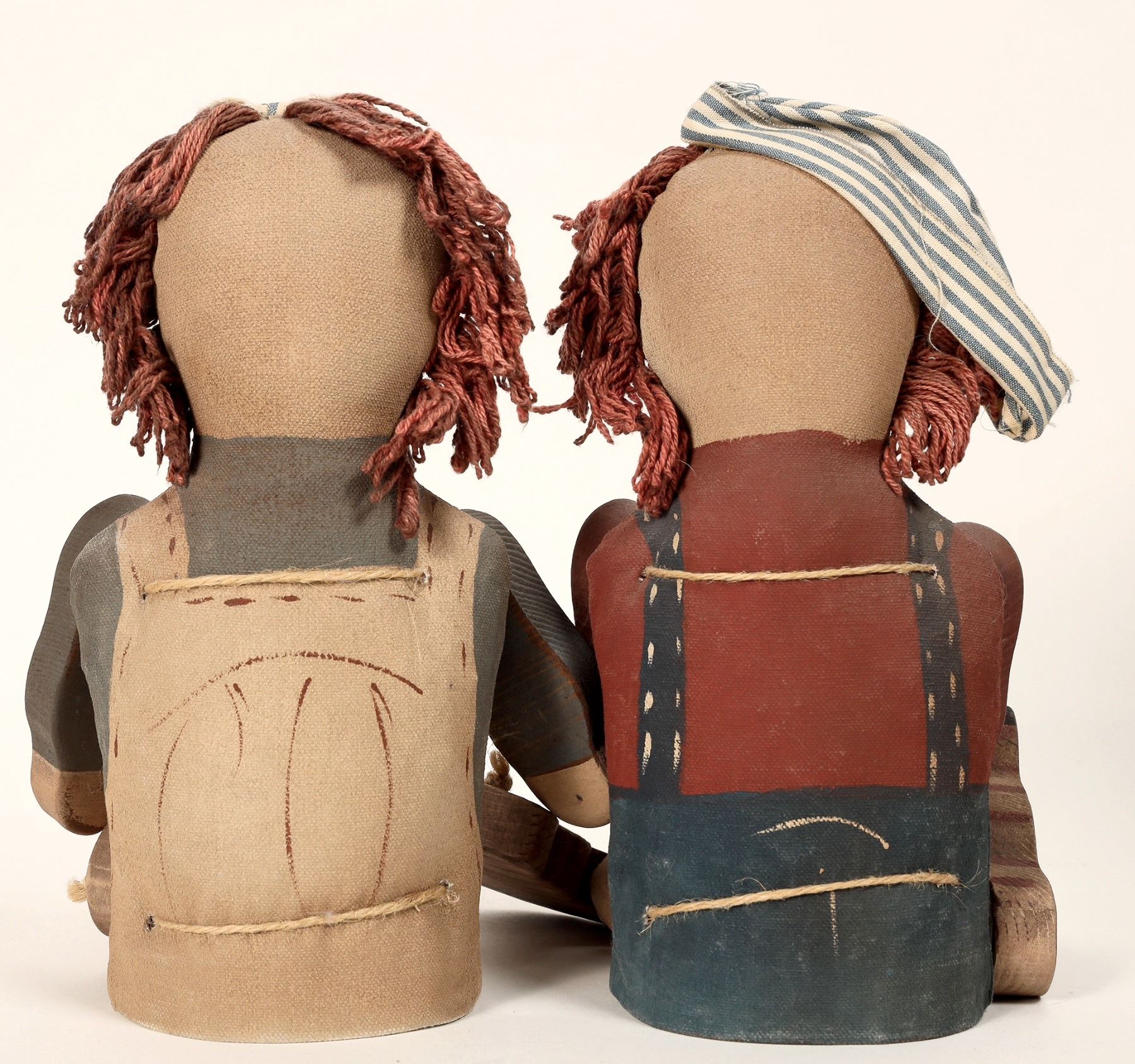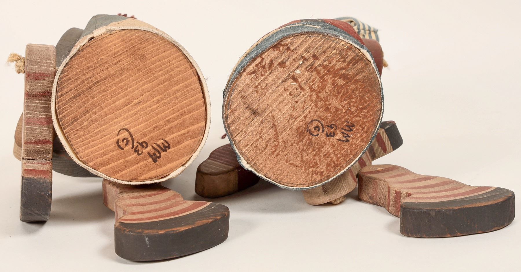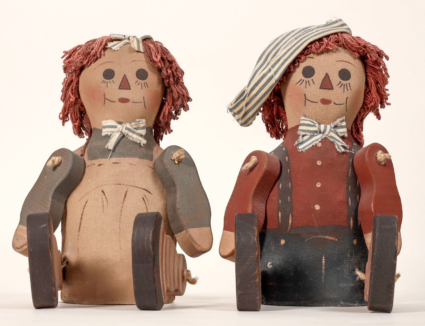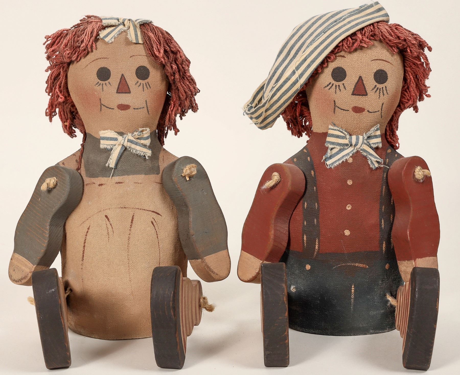 Pair of vintage Raggedy Ann and Andy dolls, Folk Art wood and cloth construction. Red string hair, signed on the bottom "MM 93". One leg is detached from string attachment. Measure about 10" tall. [