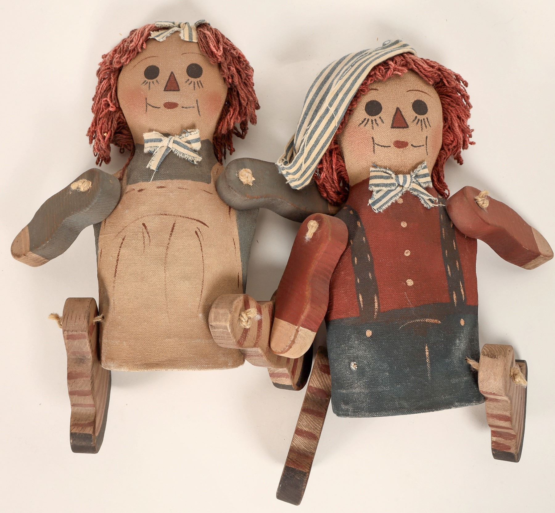 Pair of vintage Raggedy Ann and Andy dolls, Folk Art wood and cloth construction. Red string hair, signed on the bottom "MM 93". One leg is detached from string attachment. Measure about 10" tall.