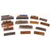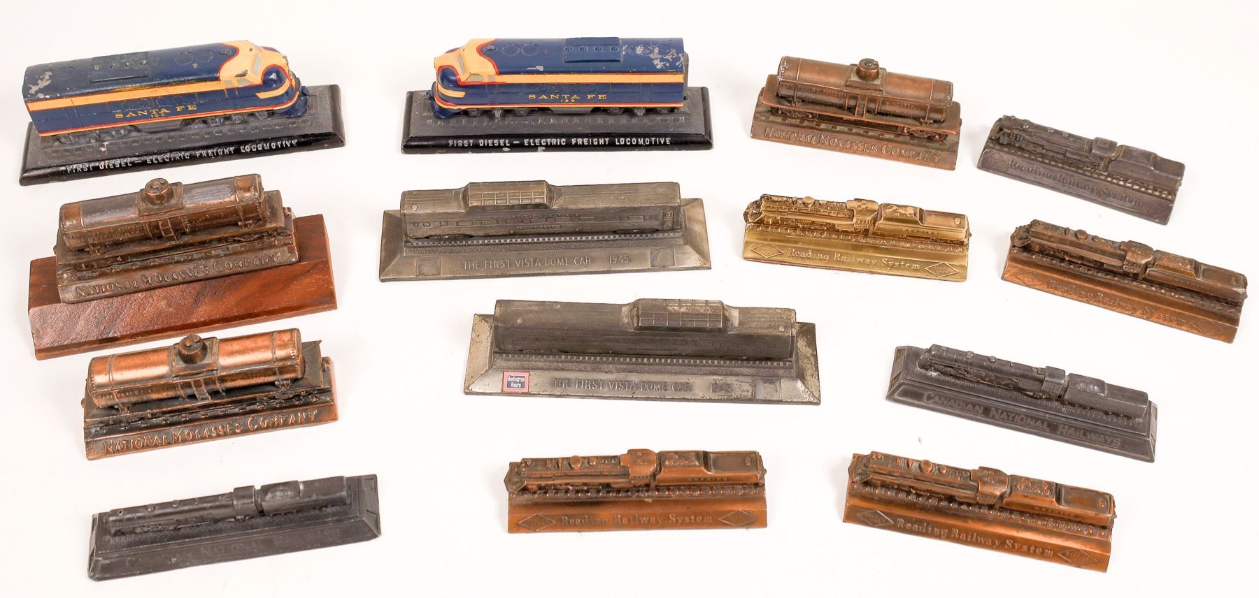 Group of 14 pieces, all duplicates from the main collection of railroad advertising paperwieghts. The lot has: five Reading RR, with 3 different (copper, white metal, brass), Canadian National Railway (2); UPRR first diesel-electric locomotive (2); Burlington Northern First Vista Dome Car (2); National Molasses Co. Tank car (2 different). Mostly 6-9" long. The condition is "average".