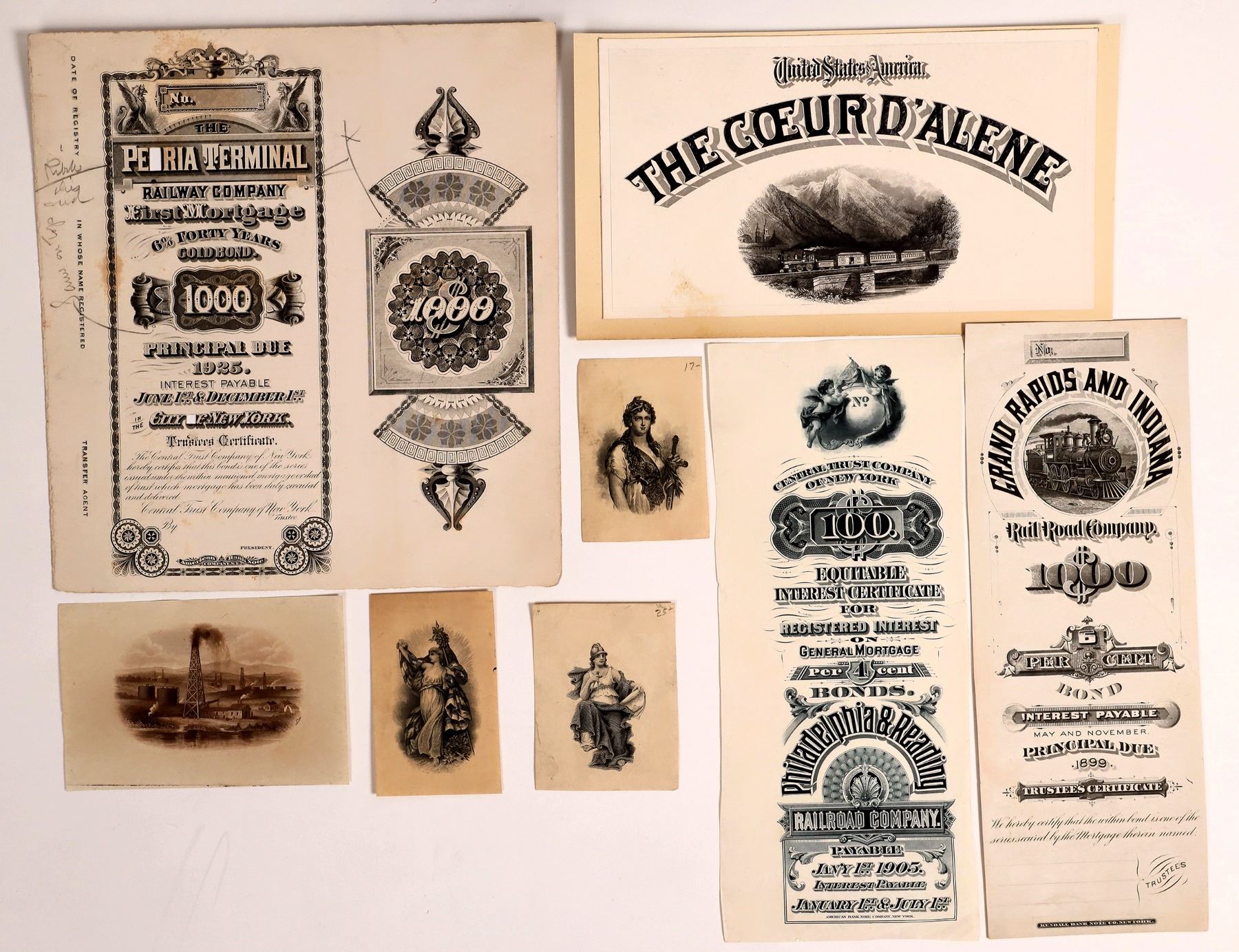 Lot of 8 different. Includes: Grand Rapids & Indiana Railroad ($1,000 bond end, Kendall Bank Note); Philadelphia & Reading RR ($100 bond end, ABN); Peoria Terminal Railway Company ($1,000 bond end pieces, ABN); Coeur D'Alene railroad scene; and 4 smaller allegorical figures. Largest is 9 x 8"; smallest is 2.75 x 2". Used on stocks and banknotes.