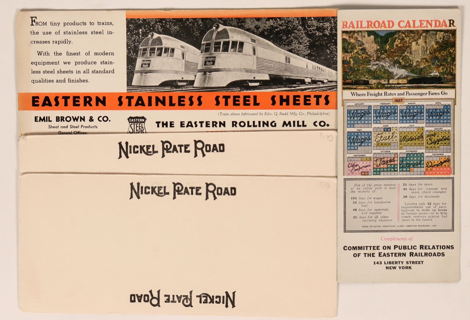 Four railroad related blotters includes two on white card stock that say Nickel Plate Road on both sides. Also, one from The Eastern Rolling Mill Co., Baltimore, Maryland advertising their Eastern Stainless Steel Sheets pictures two trains labled "Burlington Route". Lastly, a railroad calendar from 1927 from the Cmte. on Public Relations of the Eastern Railroads, New York. Very colorful.