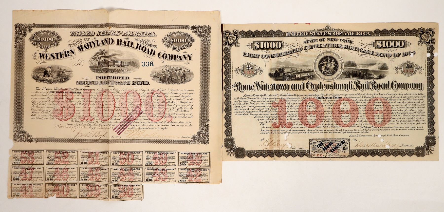 2 railroad bonds. 1868 $1000 Western Maryland Railroad with 16 coupons-edge issues, 2 small perforation etc. 1875 $1000 Rome, Watertown and Ogdensburgh Rail Road-verso tape repair. Please inspect.