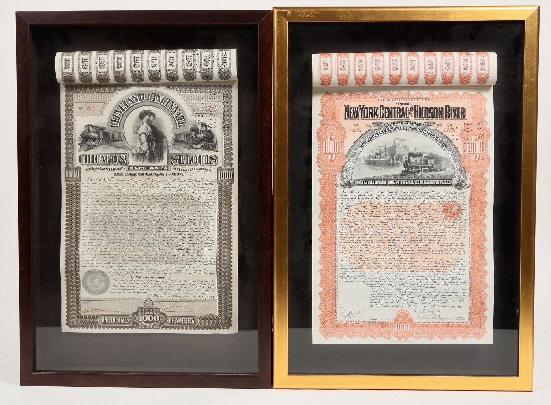 These two Railroad bonds are for the New York Central & Hudson River Railroad Company and the Cleveland, Cincinnati, Chicago & St. Louis Railroad Company, 1893. The New York Central bond has a beautiful industrial vignette scene of the train engine, sailing cargo vessel, and industrial building with coupons neatly attached. The Cleveland, Cincinnati, Chicago & St. Louis vignette has two women working the fields flanked by two locomotives. Again the coupons are neatly attached. Both are beautifully framed at 14.5 in. X 21 in. Please see photos for details.