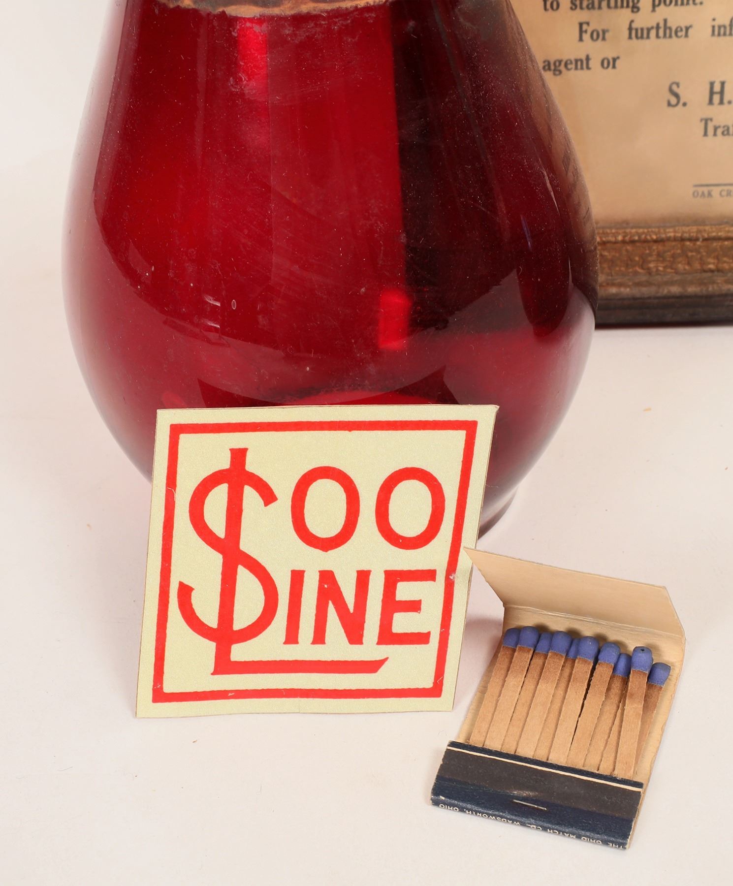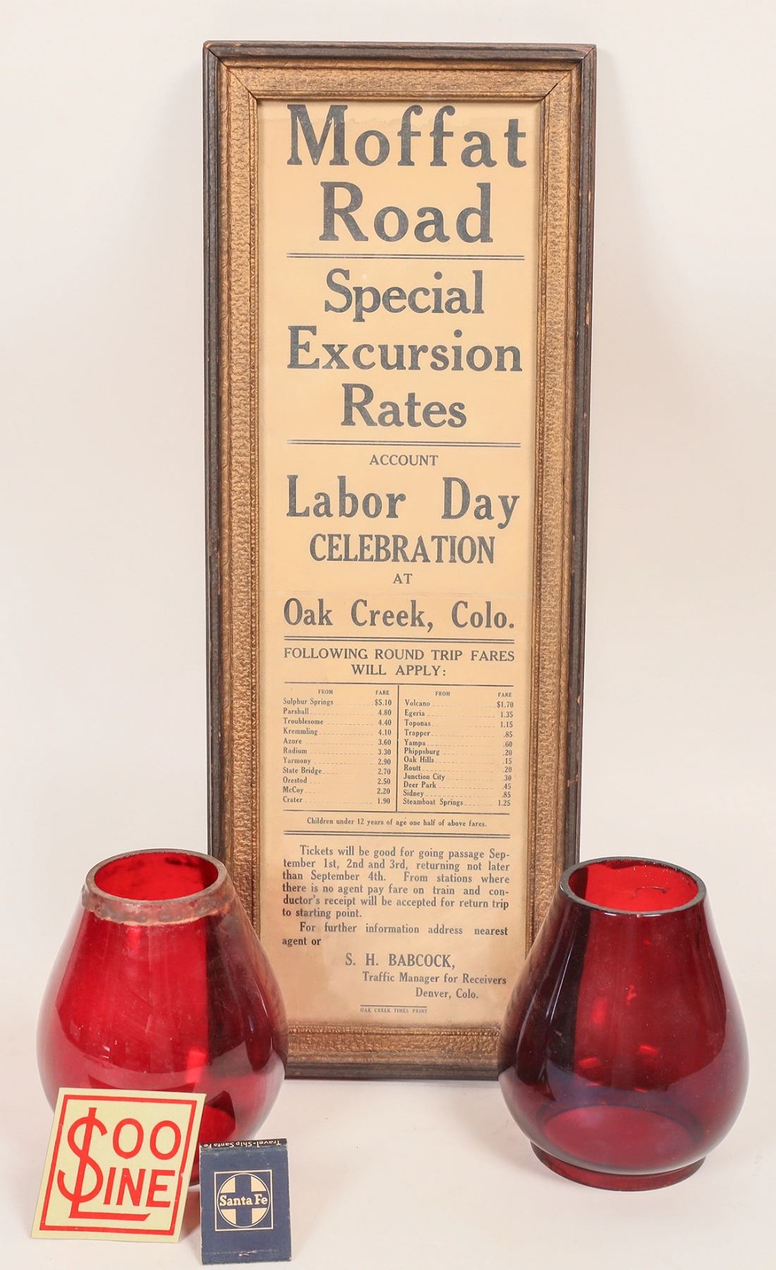 Broadside advertising a special Labor Day Excursion in the late 1890s or early 1900s by The Denver, Northwestern & Pacific Railway. It measures 7"x 20" and is framed. Also included are two red signal lantern chimneys. Both are in excellent condition. Please see photos for more details. Oak Creek Colorado Bracken Estate
