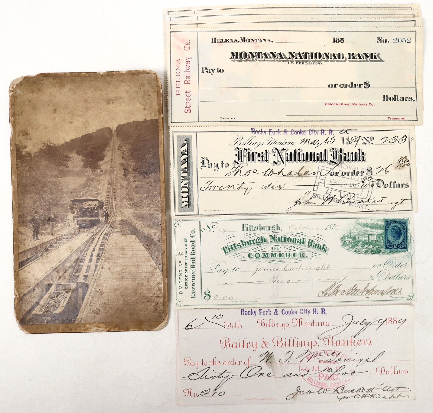 4x unissued 1880's Helena Street RW, 2 different 1889 Rocky Fork & Cooke City RR, 1879 Lawrence RR. 7.5x4.5" Mauch Chuck Incline, PA photo-fair condition.