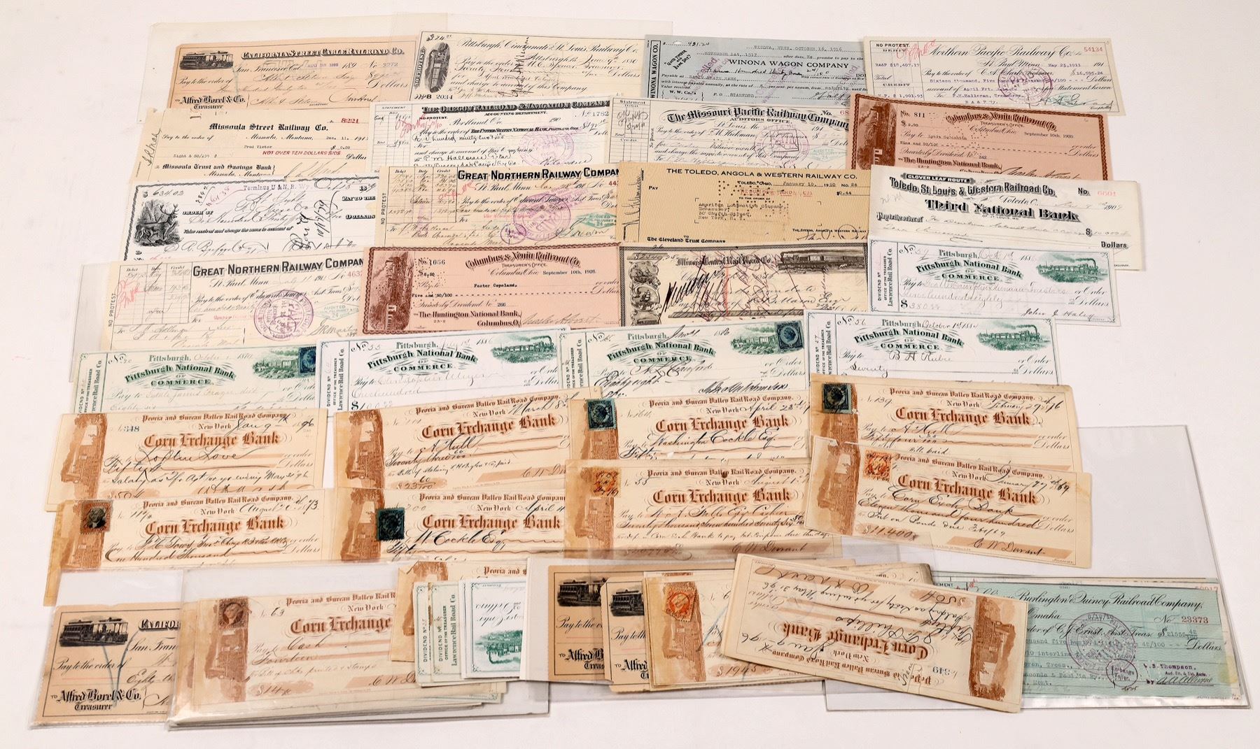Group of various railroad company checks from the Lawrence Railroad Company, Peoria and Bureau Valley Railroad Company, California Street Cable Railroad Company, Great Northern Railway Company, the Missouri Pacific Railway Company, the Oregon Railroad and Navigation Company, Columbus & Xenia Railroad Company, and others. Most of these checks are from 1870s to 1910s. Most are also pictorial with train vignettes. Some of these checks also have adhesive revenue stamps. Average size is about 7.75 x 3.25, good condition.