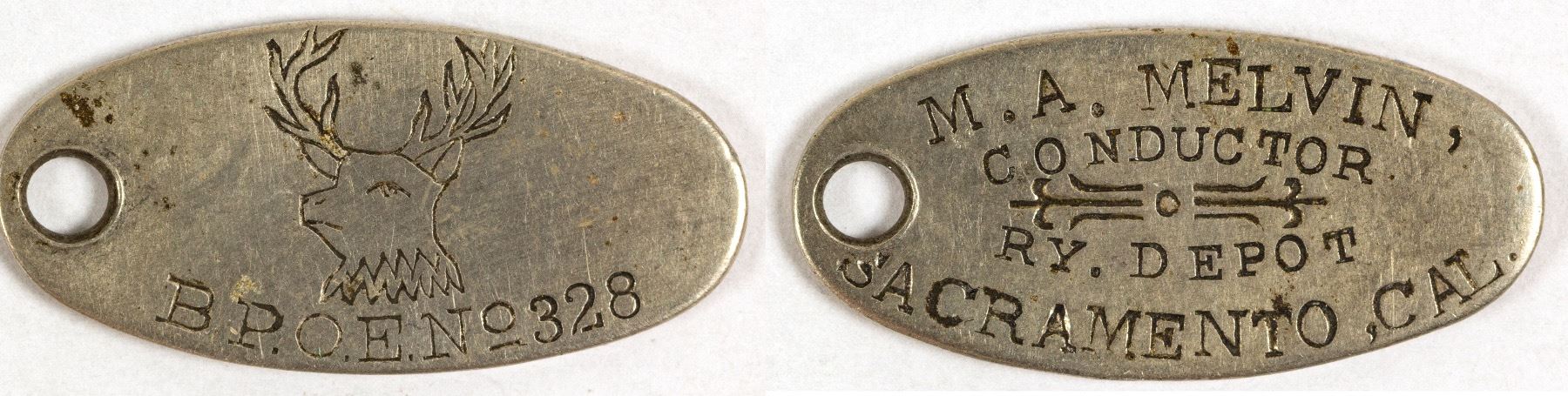 Obv.: M. A. Melvin / Conductor / Ry. Depot / Sacramento, Cal.; Rev.: (Elk pictorial) / B,P.O.E, No. 328. 31 mm x 14 mm. State: California City: Sacramento Date: ID# 76854