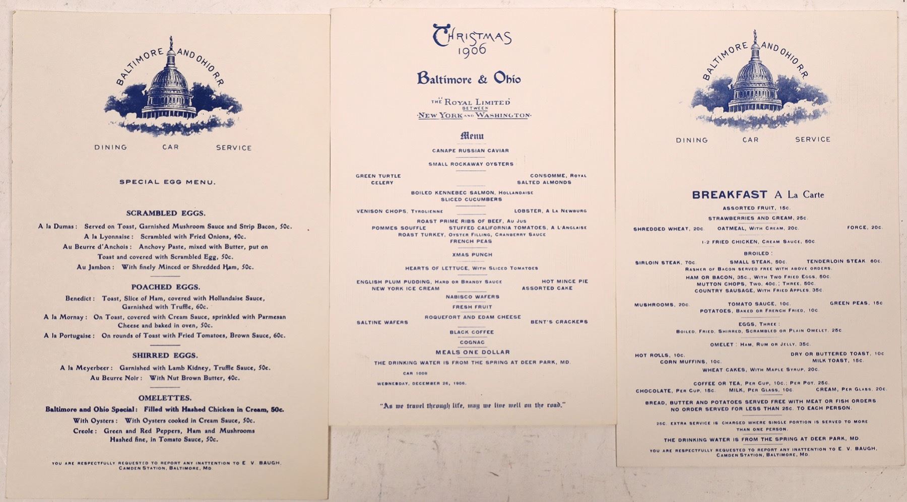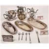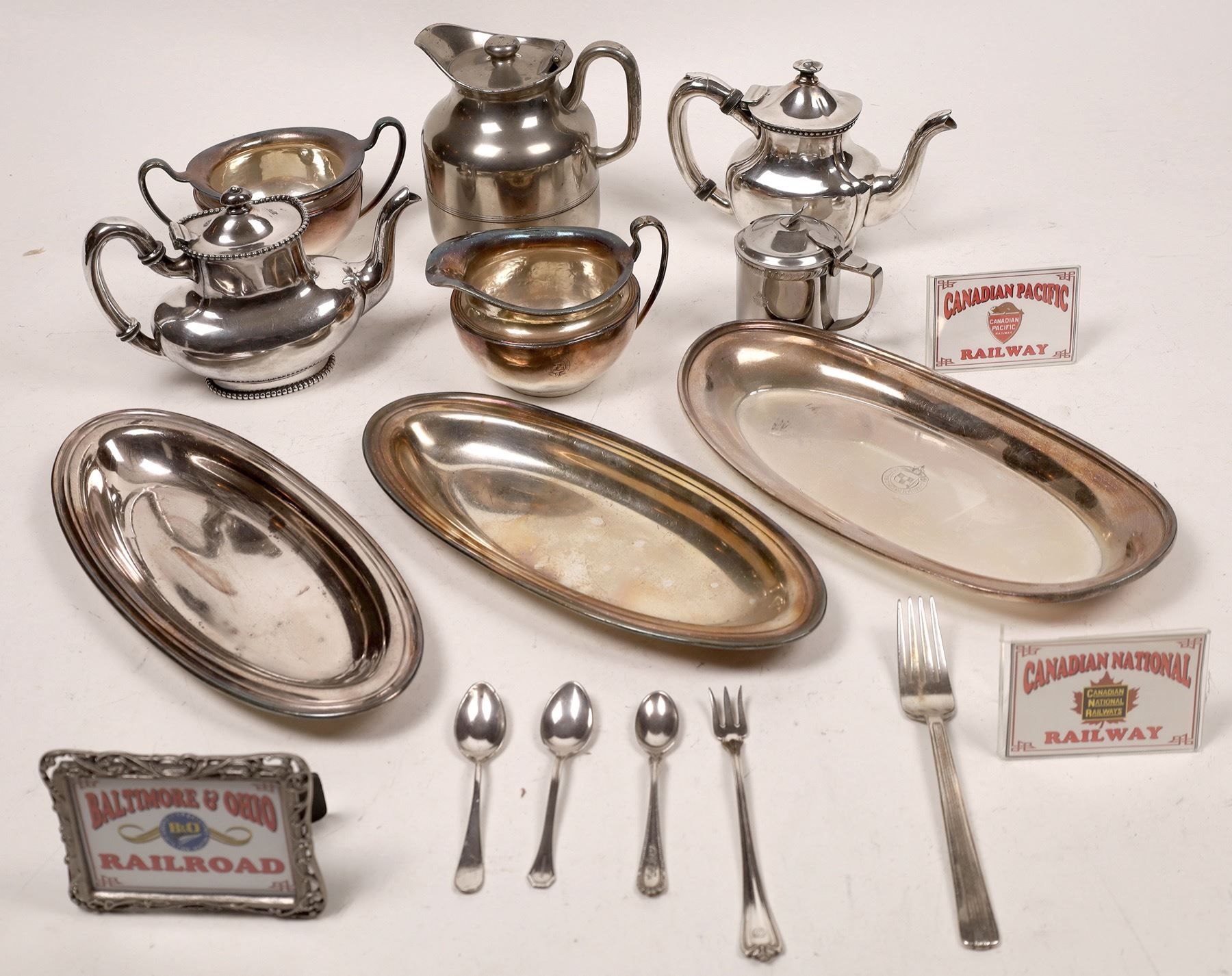 14 pieces. 3 pieces Chicago Rock Island and Pacific, 1 by Reed and Barton, the others by Mulholland Brothers. Teapot about 4"; and 2 long trays about 4x11"; Baltimore and Ohio Coffee Pot about 6"; Great Northern Railway teapot about 6"; Canadian National Railway? by Barton and Reed about 4"; Canadian Pacific sugar bowl; small serving tray 6x1" by Wiley; hot water for tea (not silver); 5 misc railroad marked pieces of flatware