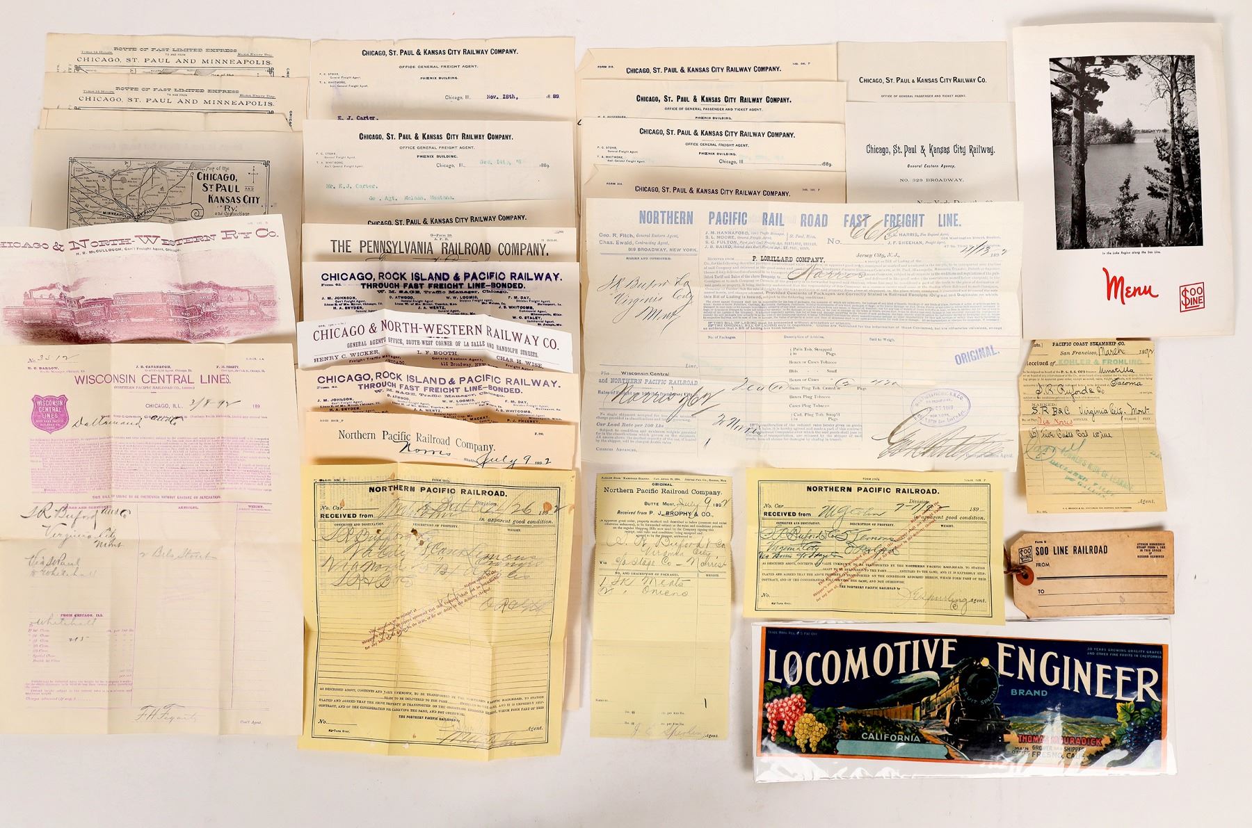 Railroad ephemera package(24) that includes maps, schedules and even a menu from various railroads like the Chicago, St. Paul & Kansas City Railway Company, Soo Line, The Pennsylvania Railroad Company and more. All in nice condition. Please see photos for more details. 1800s