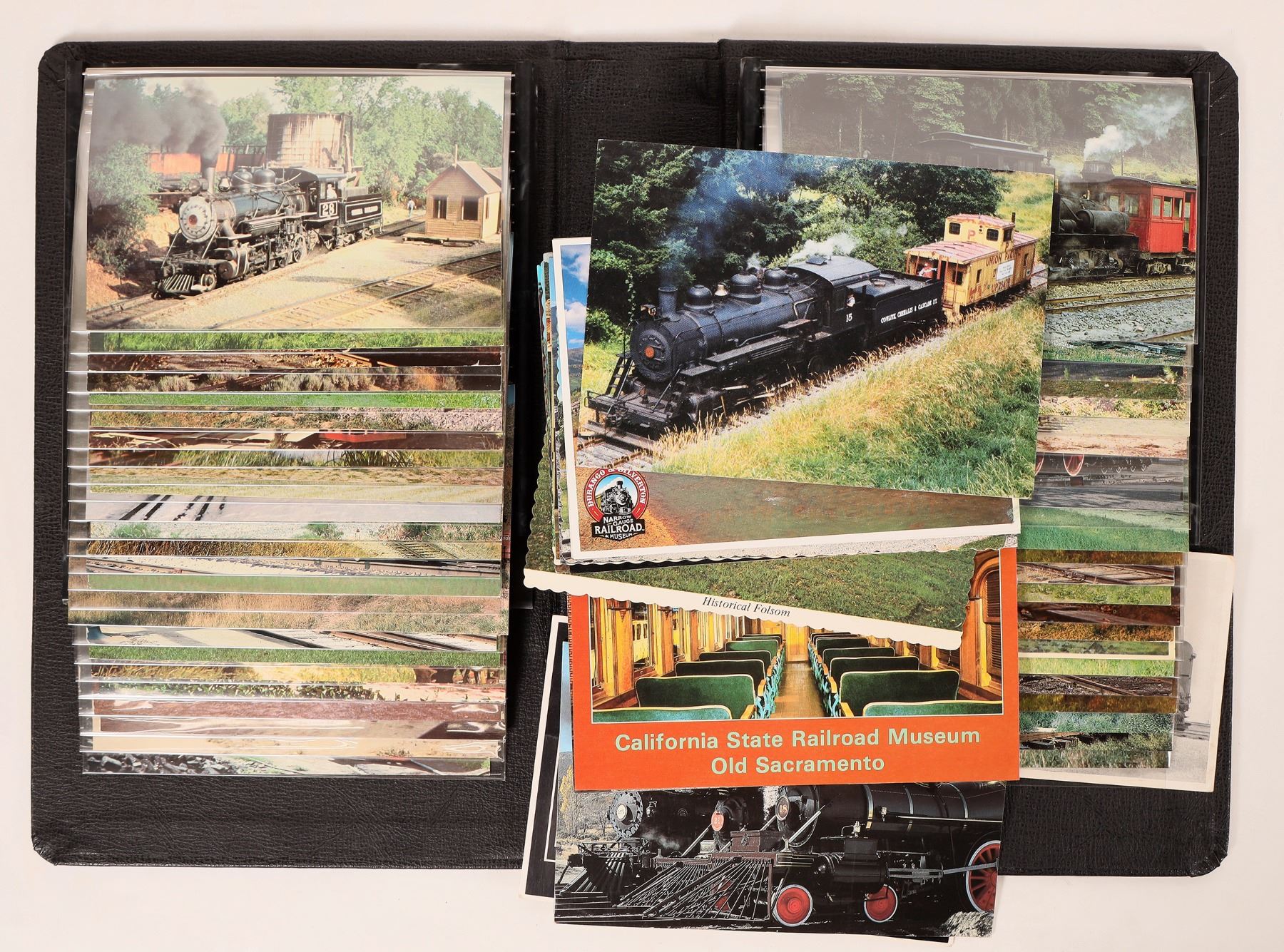 A collection of railroad ephemera includes an album of 50+ postcards, c1970s-modern, some canceled, most blank. The album comes with a matching protective case. Also included are: eight additional large blank railroad themed postcards; a group of 15 Magyar Posta railroad themed canceled stamps from Hungary, c1970s; and seven railroad magazines and pamphlets, c1950s-80s. Please see photo(s) for more details.