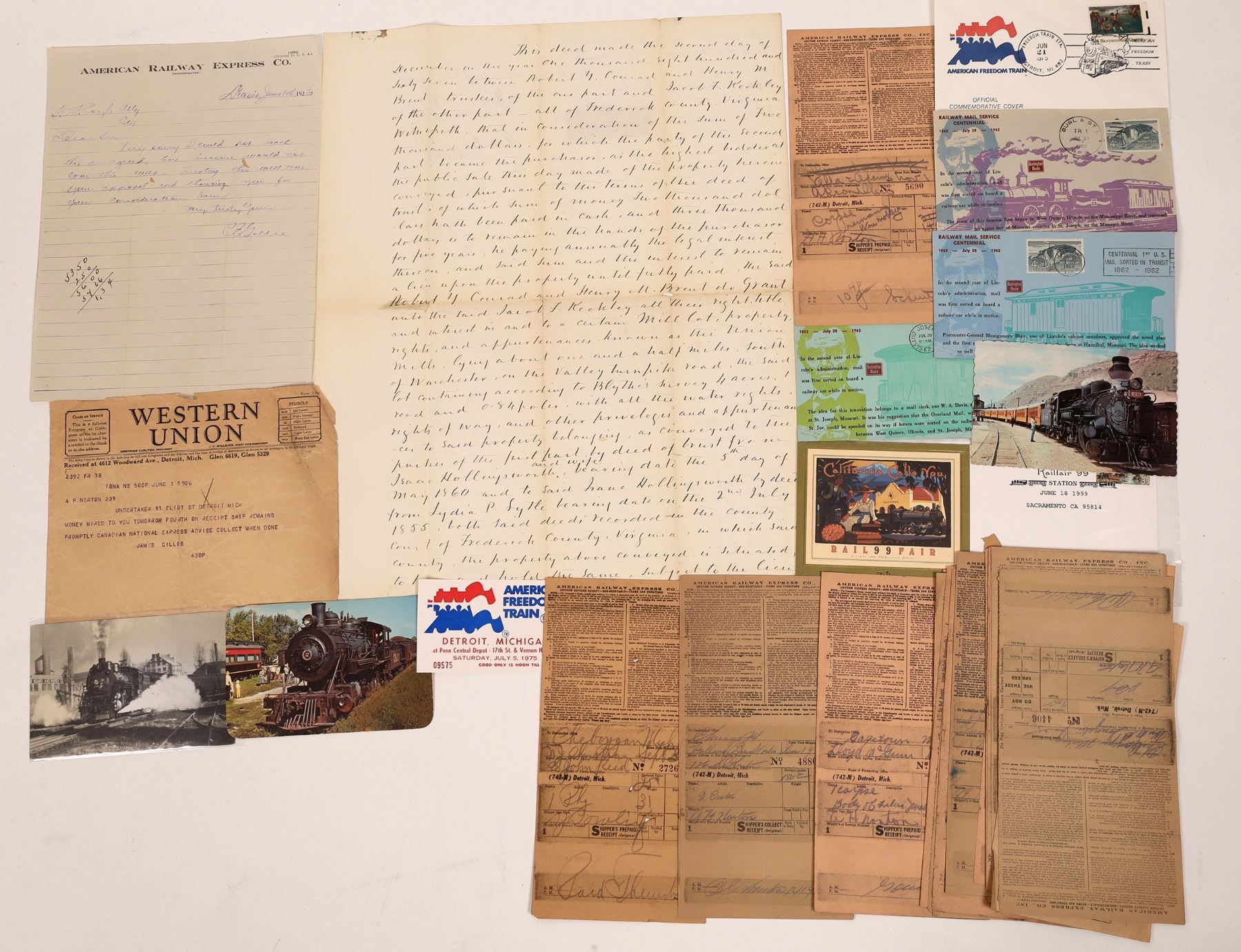 Lot of over 20 pieces of railway ephemera. American Railway Express Co. First Day Covers from the American Freedom Train, Detroit, 1975; locomotive postcards; Railway Mail Service Centennial First Day Covers, 1962, St. Joseph, Missouri; California Railfair, 1999, Sacramento.