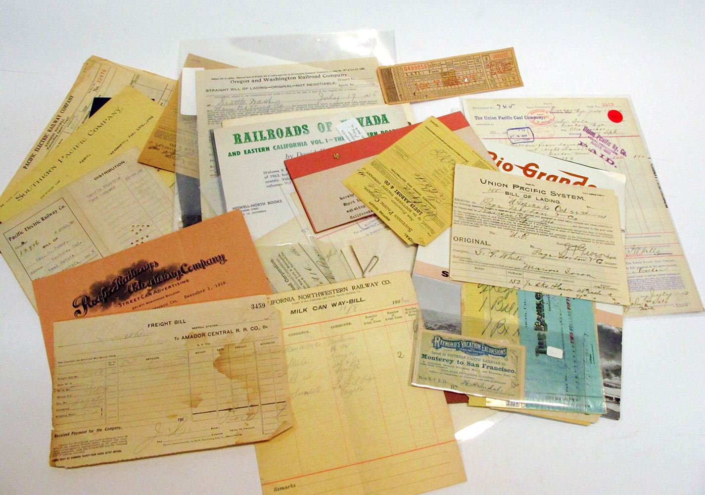 This is an incredible collection of railroad ephemera from different roads and eras. dating back to the 19th Century, this lot includes freight bills, photos, bill heads, along with publications from as recent as 1969 (A model railroader price list). Date: Location: HWAC# 571833
