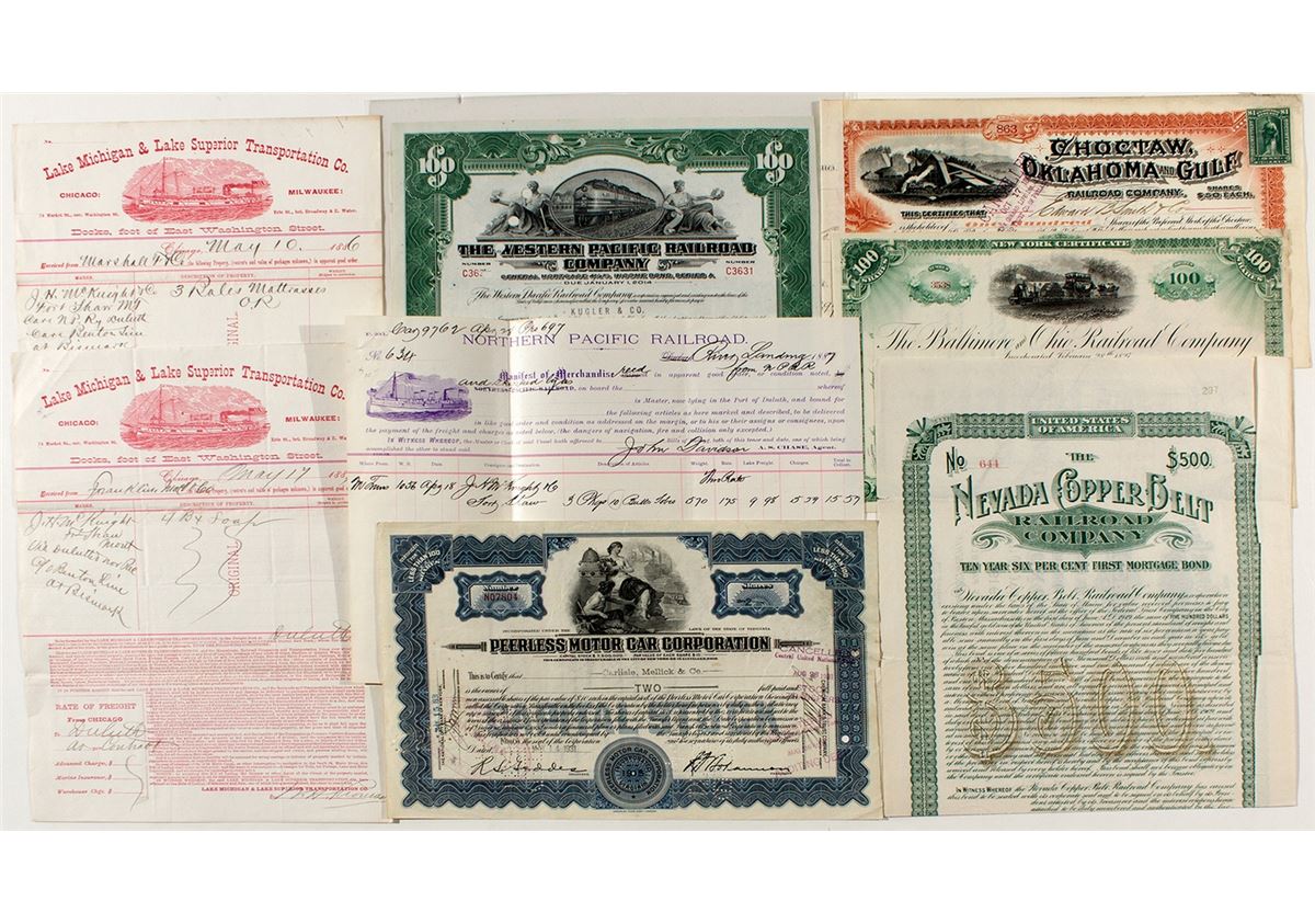 Lot of eight. 1) Nevada Copper Belt $500 bond 1919. 2) Choctaw, Oklahoma and Gulf Railroad Company 1897 stock number 863. 3) Western pacific Railroad bond 2014. 4) Peerless Motor Car Corporation 1931. 5) Unused Baltimore and Ohio railroad. 6-7) Lake Michigan and Lake Superior Transportation Company bills. Vignette of lake steamer. 8) Northern Pacific Railroad Manifest of Merchandise 1887.
