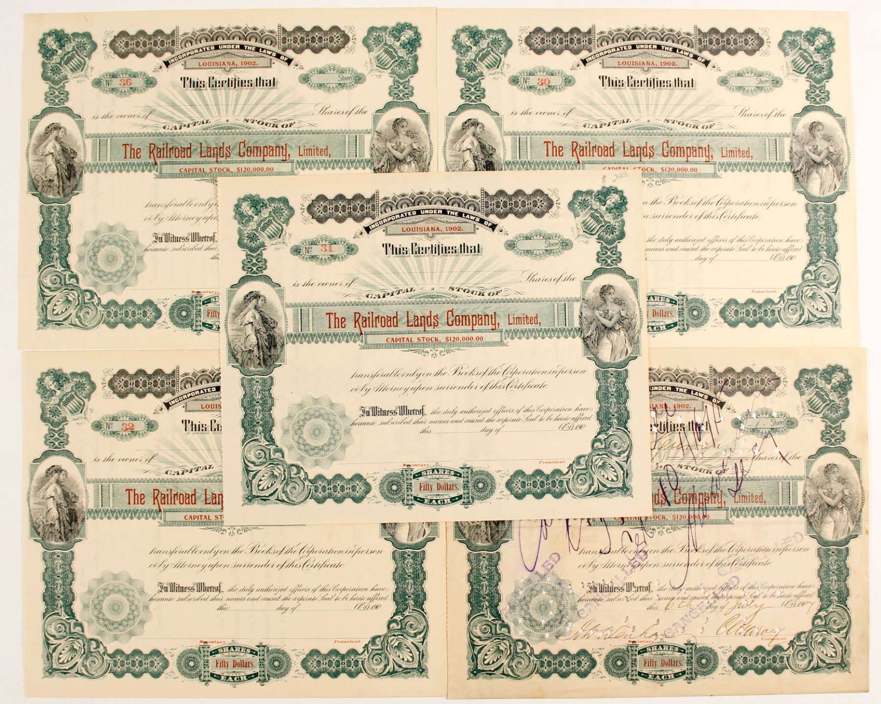 5 total certificates. One is signed and i/c; all others are NOT issued and in very good condition. Two vignettes of women on both sides of the certificates. . Ken Prag Collection