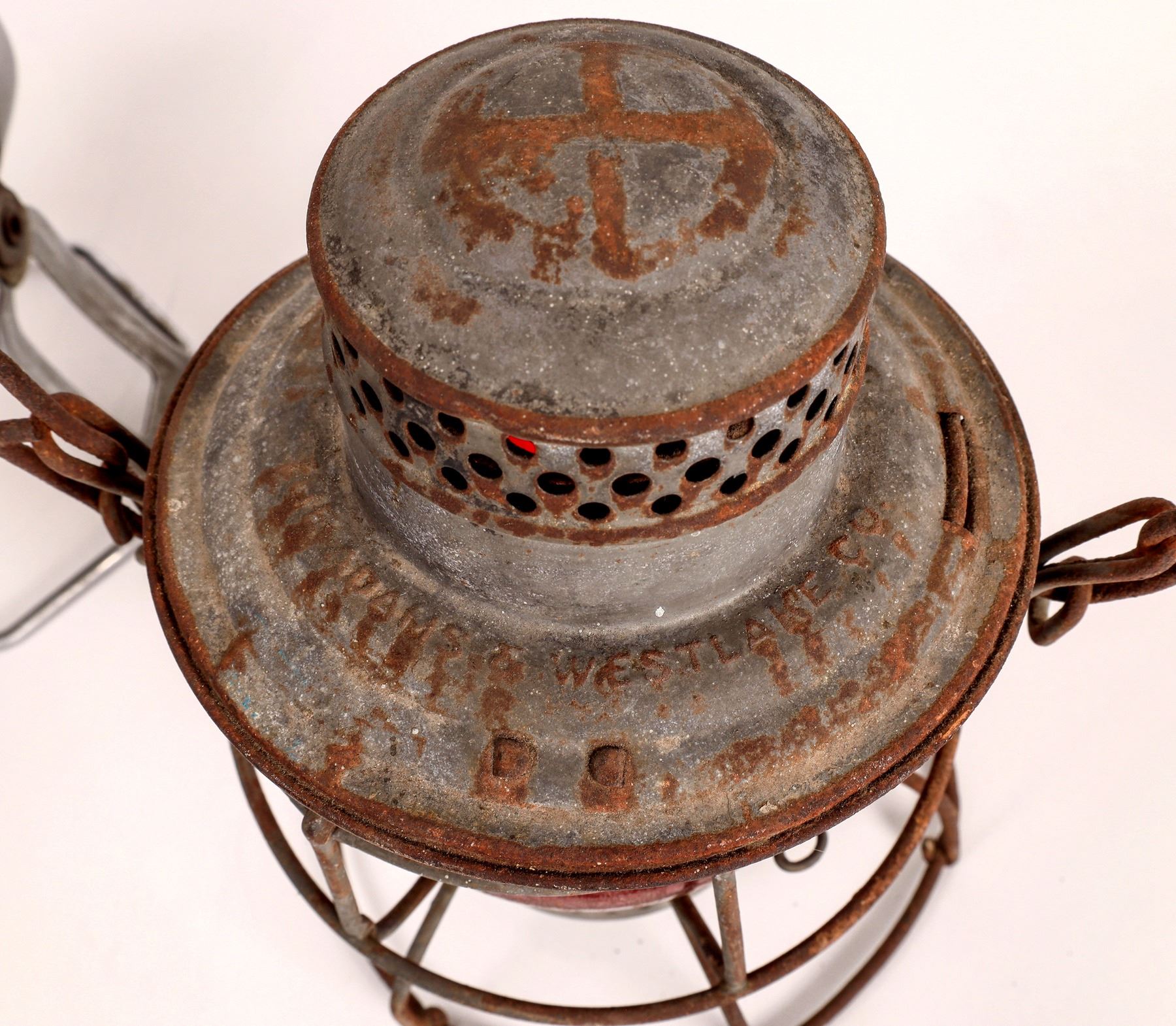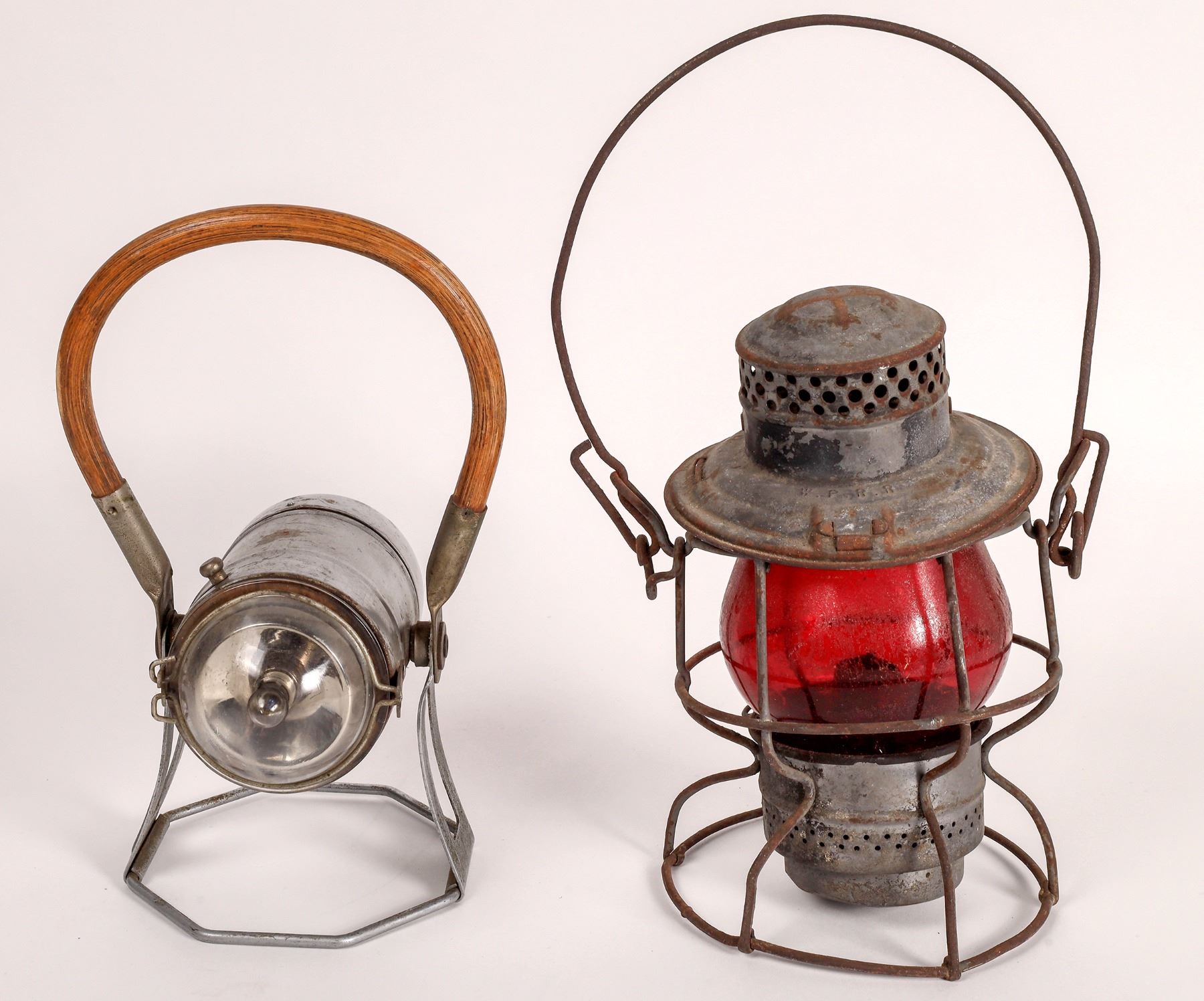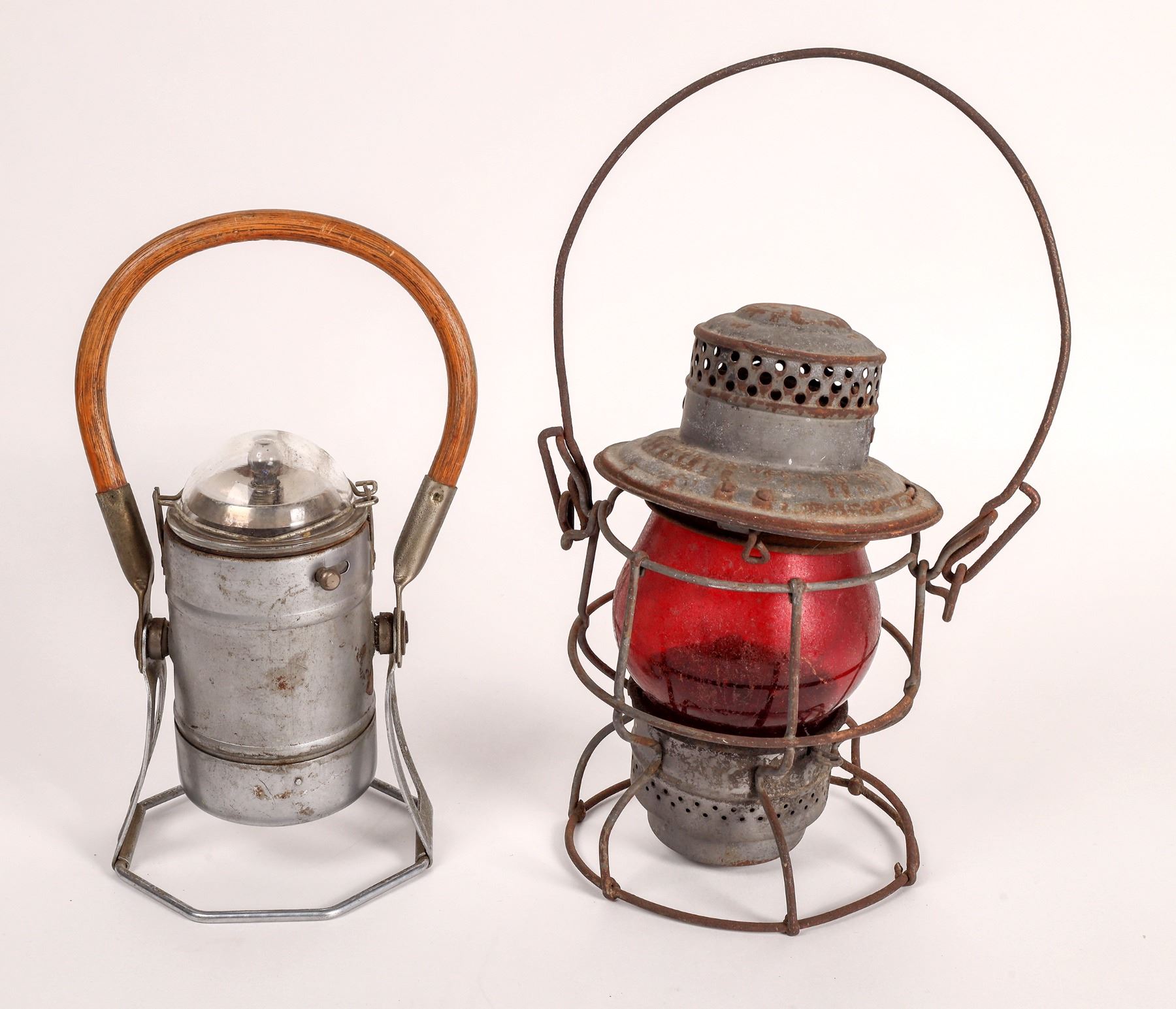 This lot has an Adams & Westlake railroad lantern with a red lens stamped on the lid with "W.P. RR" (Western Pacific) railroad. The lens is marked "Handlan /St. Louis" and has been lacquered. In fair condition, at 14 in. high. The second lamp is an electric lamp made by Economy Electric Lantern Co. of Chicago. Ill. 1950's-1970's.This lantern has a wood bail and is in good condition.