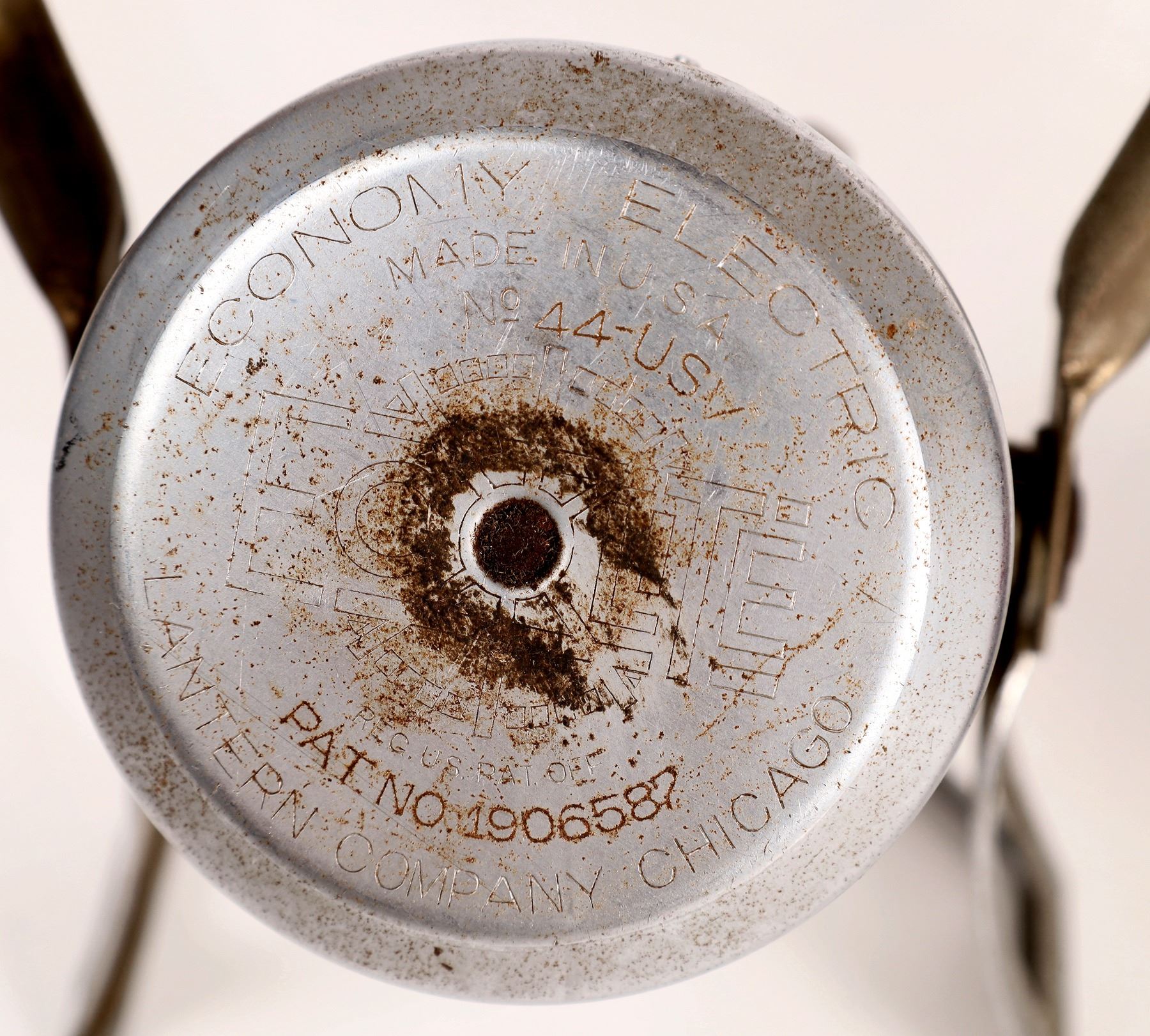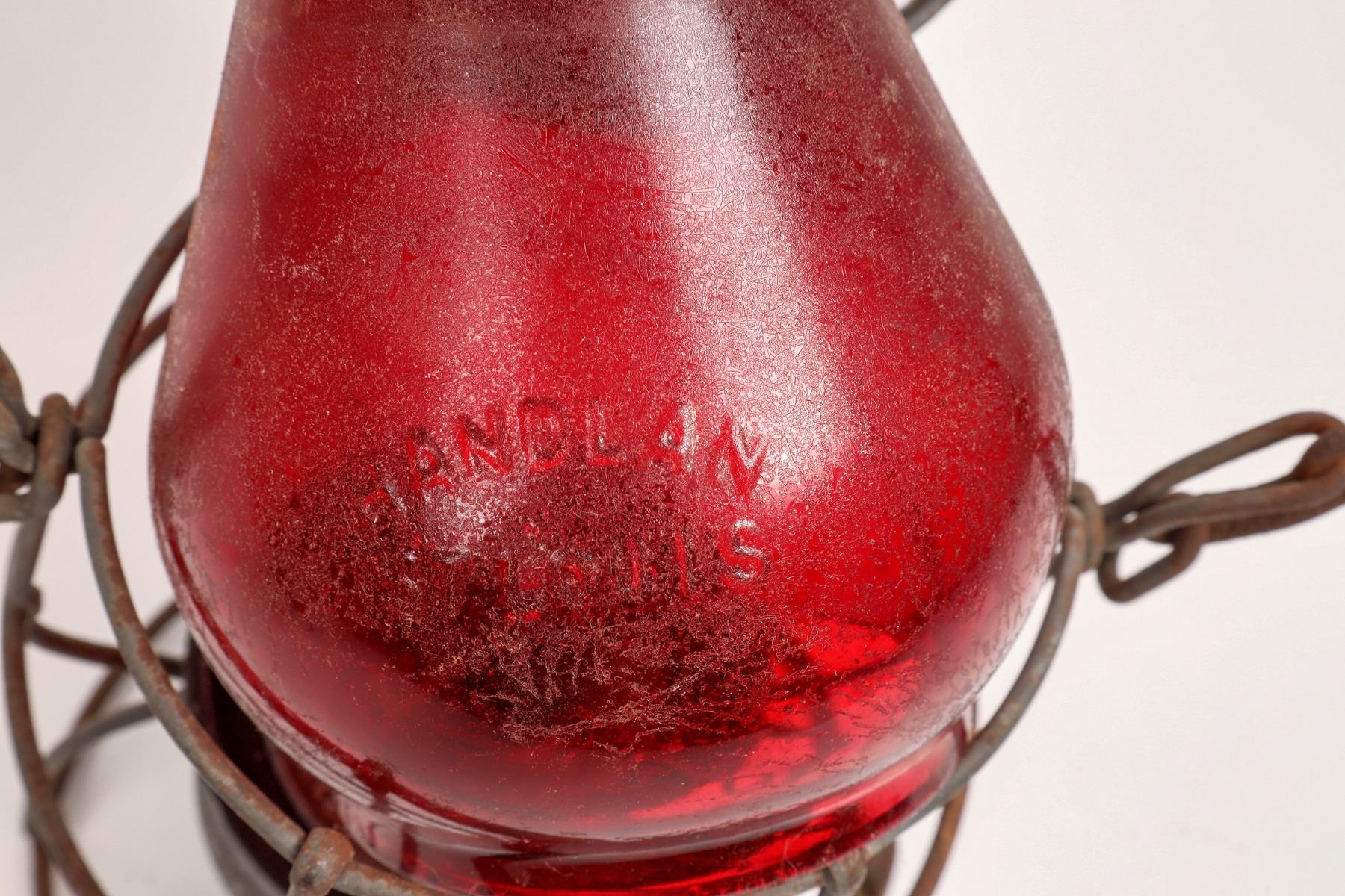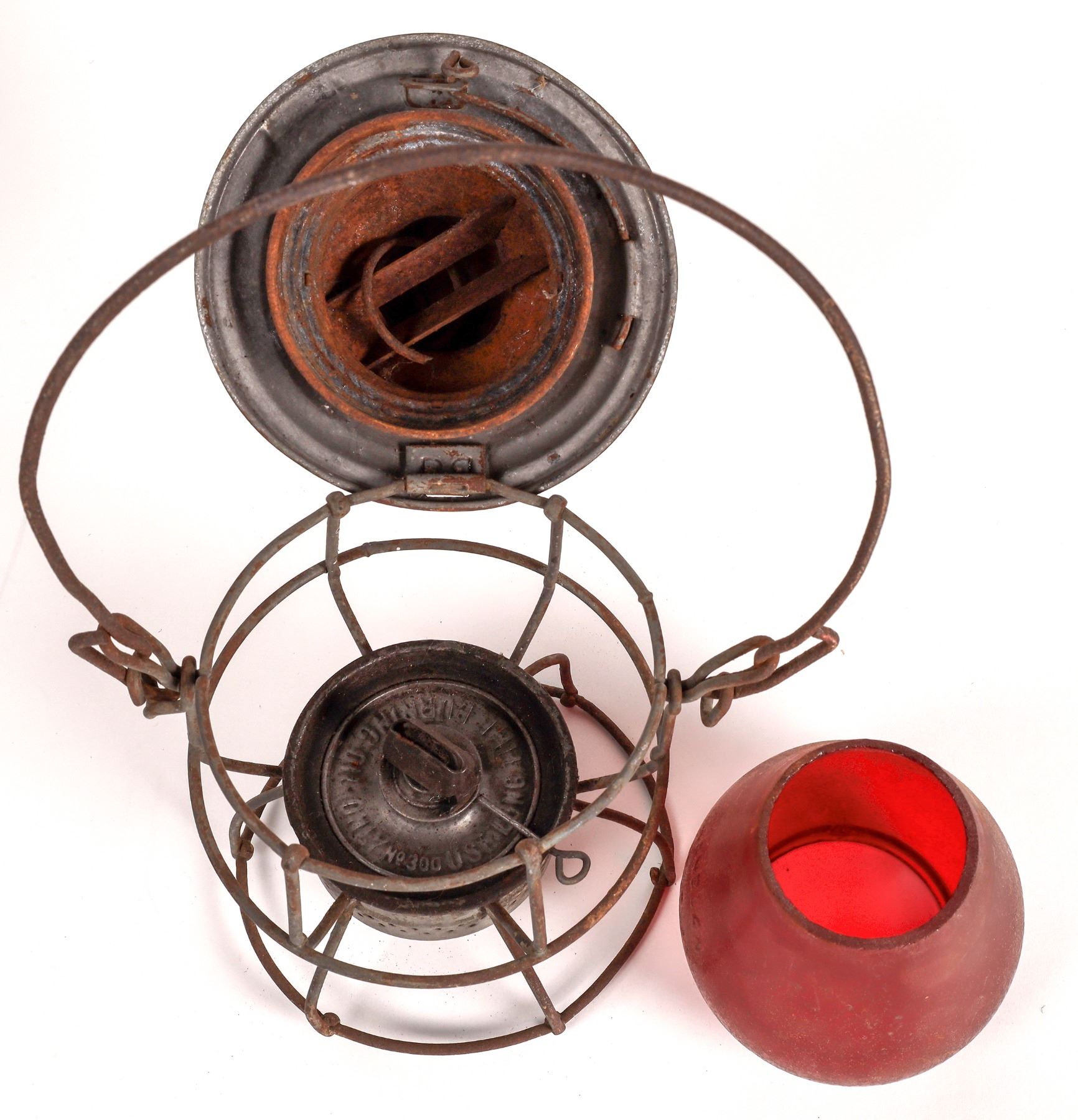 This lot has an Adams & Westlake railroad lantern with a red lens stamped on the lid with "W.P. RR" (Western Pacific) railroad. The lens is marked "Handlan /St. Louis" and has been lacquered. In fair condition, at 14 in. high. The second lamp is an electric lamp made by Economy Electric Lantern Co. of Chicago. Ill. 1950's-1970's.This lantern has a wood bail and is in good condition.