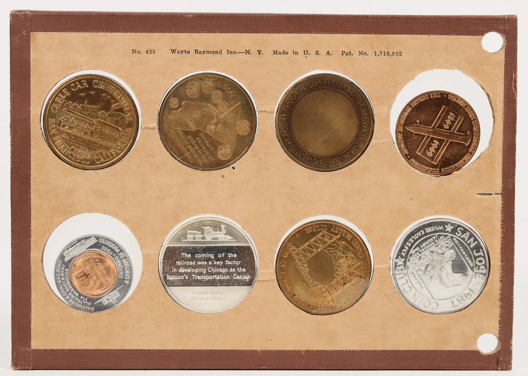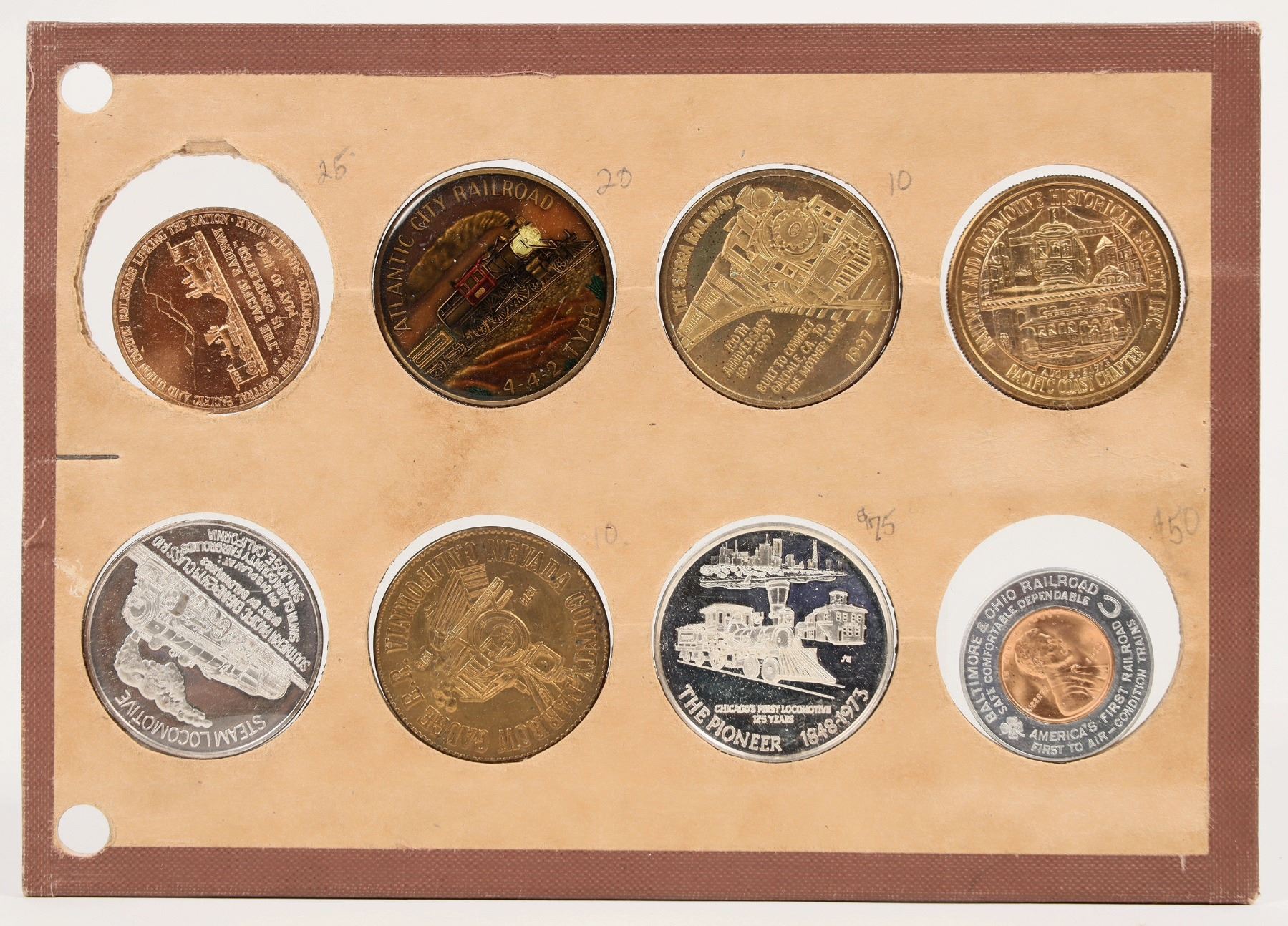 Eight railroad related medals: 1) Baltimore and Ohio Railroad 1933 brilliant uncirculated Lincoln encased cent. 2) Railroad and Locomotive Historical Society Cable Car Centennial 1973. 3) The Sierra Railroad 1997. 4) The Pioneer 1848-1973. 5) Atlantic City Railroad. 6) Nevada County Narrow Gauge Railroad. 7) 1969 Golden Spike Centennial. 8) Steam Locomotive on display in San Jose 1987.