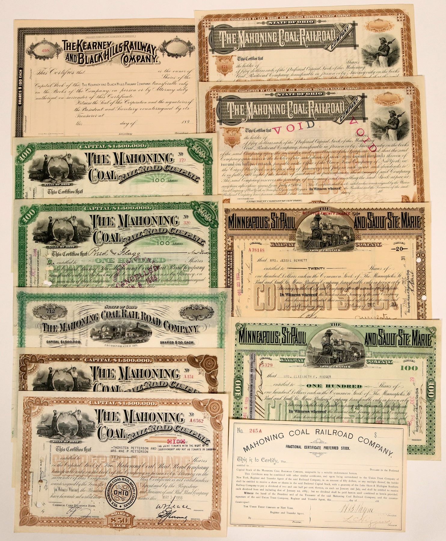 1) Eight certificates include issued and cancelled , unissued/uncanceled, preferred/common stock. BROWN (4) @ $50 par, vignettes allegorical figures & state seal. GREEN (3) @ $50 par, vignettes trains and allegorical figures. Fractional preferred unissued/signed, no vignette. 2) Two common stock certificates. I/U, $100 par, vignette of 4-4-0 loco r-l man alongside, "COMMON STOCK" underprint in respective colors. #15329 100 shares issued Dec 3, 1929. #A38148 20 shares issued Dec 22, 1931. American Bank Note Co printer. Both EF. 3) #498, unissued/uncanceled (U/U), common stock @ $100 par. $5,000,000 capital. BLACK, no vignette. Wavy company title top and block lettering in body of certificate. Dated 189_. Gibson, Miller & Richardson printer.