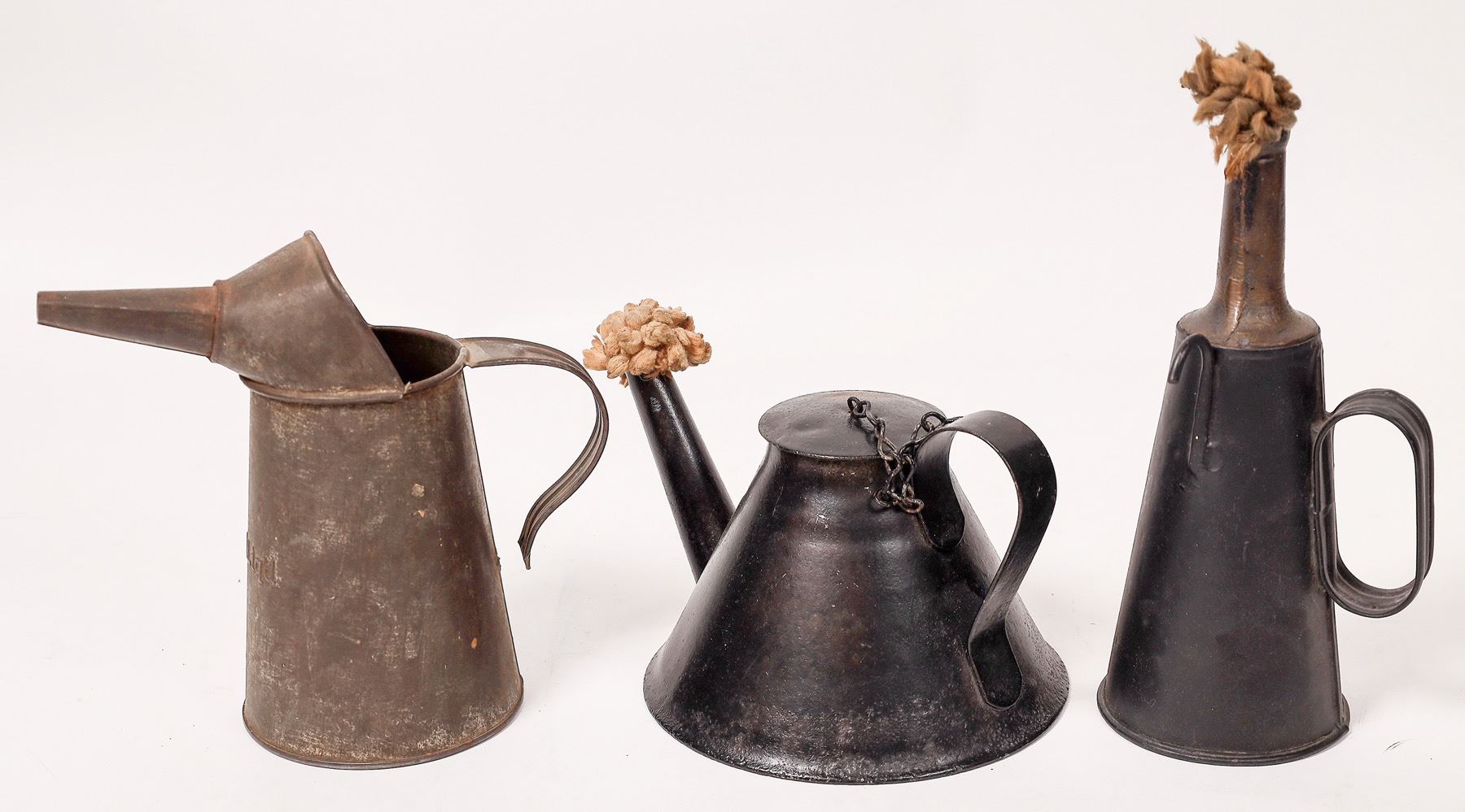 2 black oil wick railroad lamps, 5.5" and 9". 1 Qt. Liq'd. oil can with detached lower handle connection.