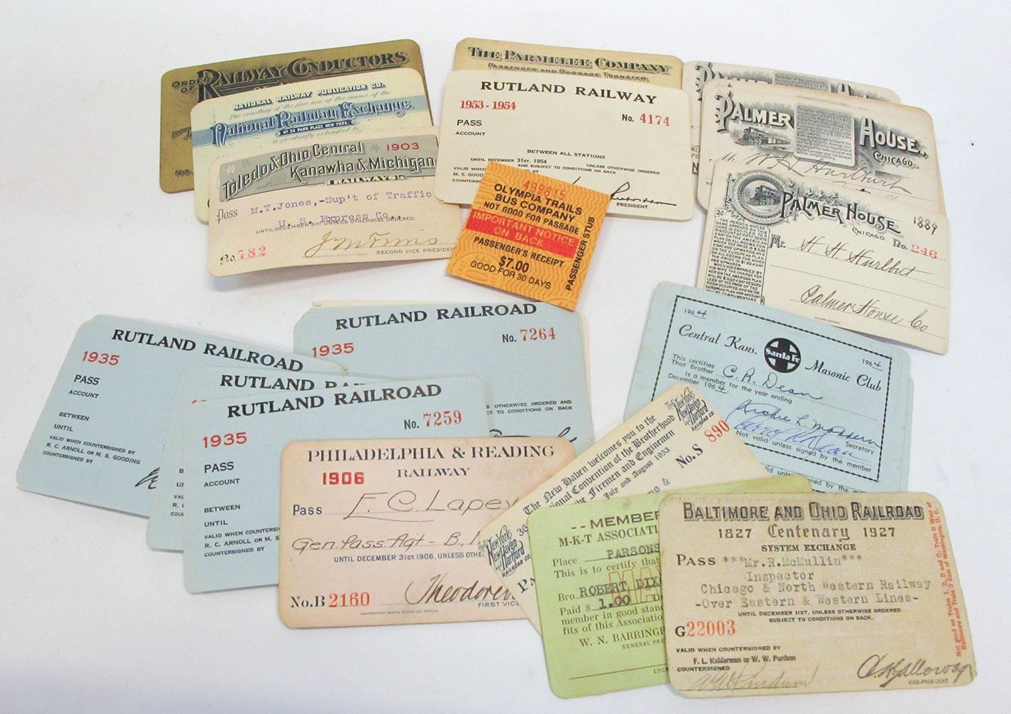 Approx 20 railroad passes 1895-1954 from National Railway Exchange, Rutland Railway, Palmer House Chicago, Philadelphia & Reading Railway, Baltimore and Ohio Railroad and more. Date: Location: HWAC# 56143