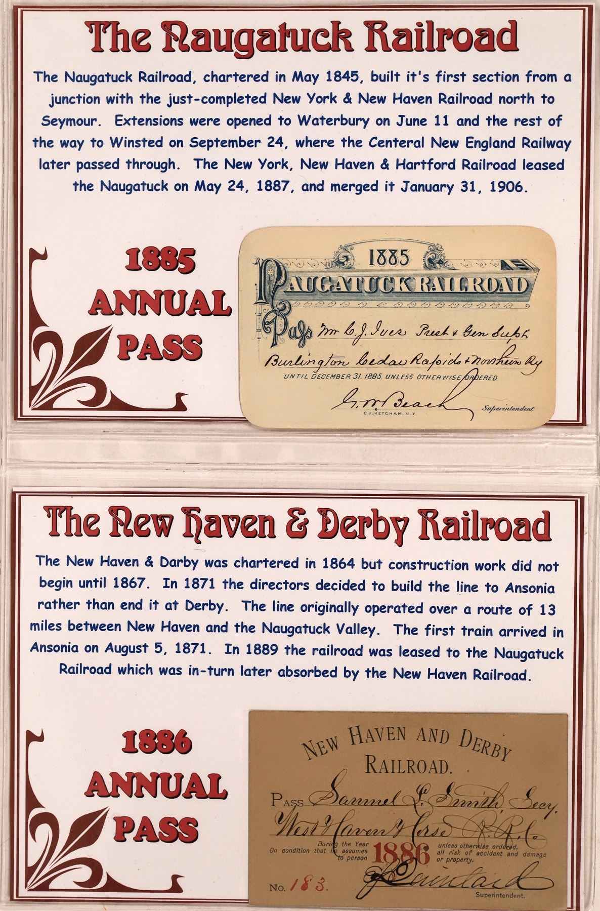 Four railroad passes from the 1890s, displayed with historical context. 1) Fitchburg Railroad, 1892, number 2039, issued to Frank Priest and signed by John Adams. 2) Fitchburg Railroad, 1893, number 634, issued to D. W. Jordan and signed by John Adams. 3) Naugatuck Railroad, 1885, not numbered, issued to C. J. Ives and signed by G. M. Beach. 4) New Haven and Derby railroad, 1886, number 183, issued to Samuel L. Smith.
