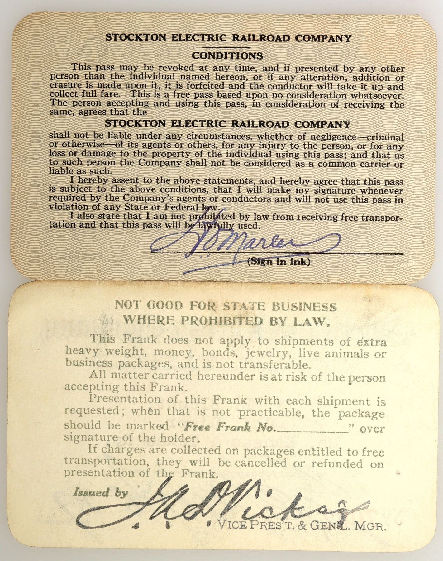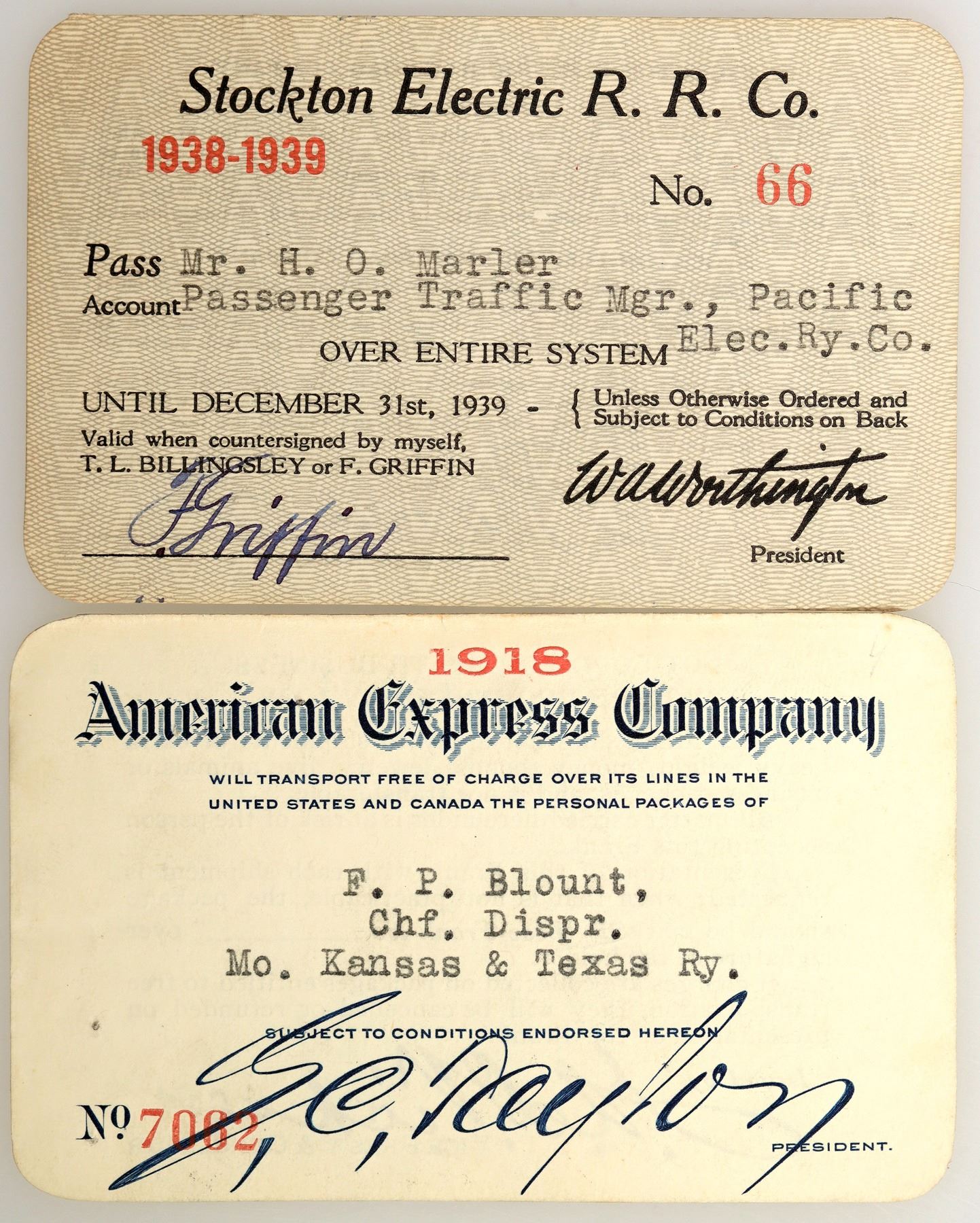 Lot of 2 different. 1) American Express Company pass issued for 1918 to FP Blount of the Missouri Kansas & Texas Railway. Preprinted signature of president Taylor. Reverse signed by the vice president. 2) Stockton Electric Railroad Company. Pass issued for 1938-39 to HO Marler of the Pacific Electric Railway. Countersigned by F. Griffin. 1918-1938