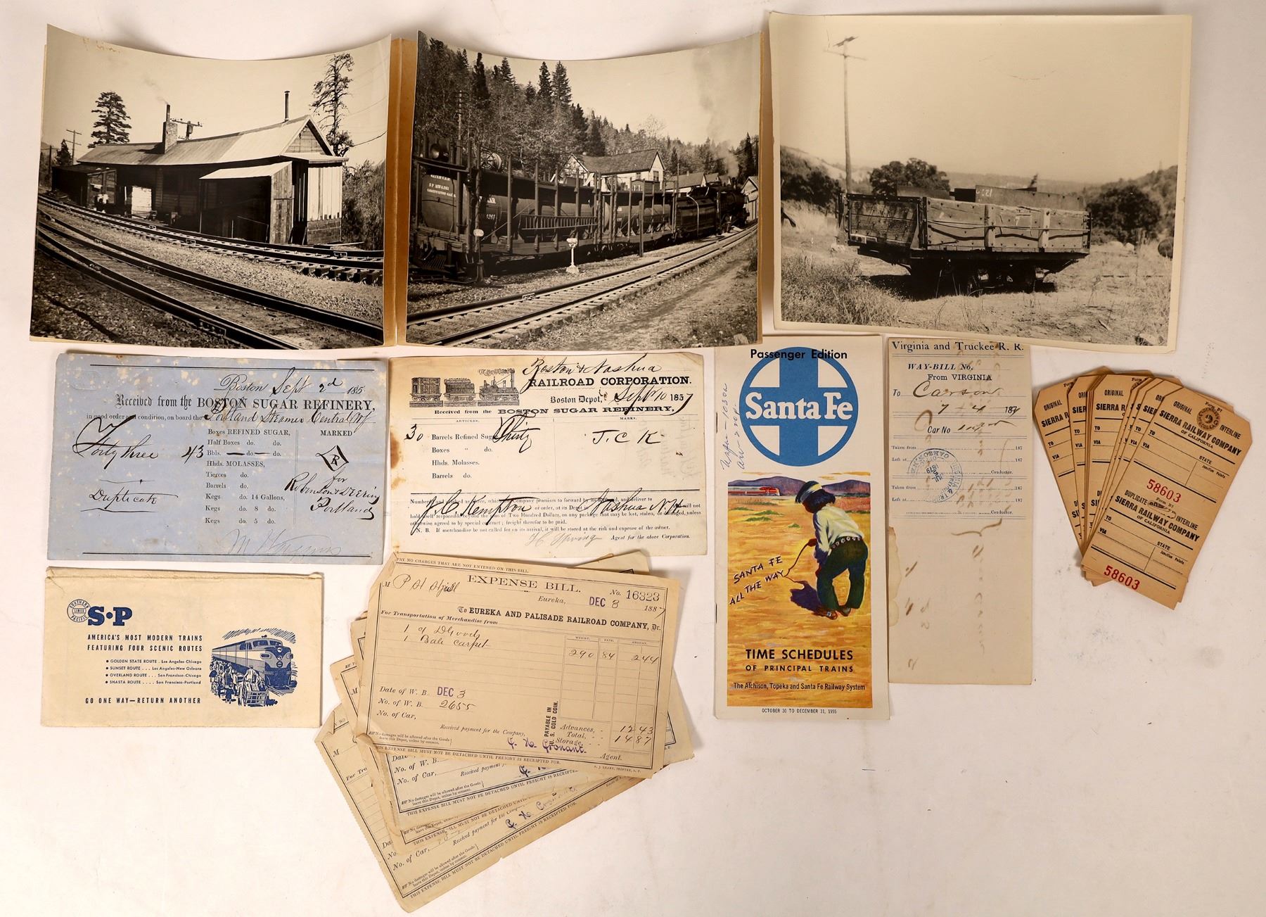 Lot of 24. Three photos of train rails/buildings, Eleven Blank baggage tickets Sierra Railway of Calif., Five Eureka and Palisade RR expense bills 1887-92, one expense bill Portland Steamer Central 1851, one Boston and Nashua Railroad corp expense 1857, one V&T RR waybill 1879, one AT&SF ticket w/envelope 1951 and time table 1955. Very good condition.
