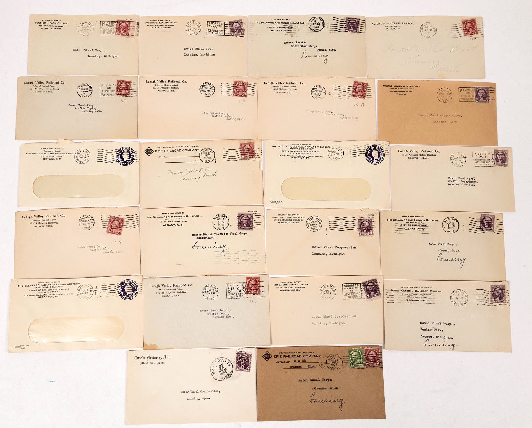 This lot of 21 postal covers are from railroad companies across America. All sent to Motor Wheel Corp. from: Southern Pacific Lines, The Delaware and Hudson RR, Alton and Southern RR, Lehigh Valley RR, Missouri-Kansas-Texas Lines, New York, Ontario and Western Railway, Erie RR Co., The Delaware, Lackawanna and Western RR, Southern Pacific Lines, and Maine Central RR Co. State: City: Date: Provenance: