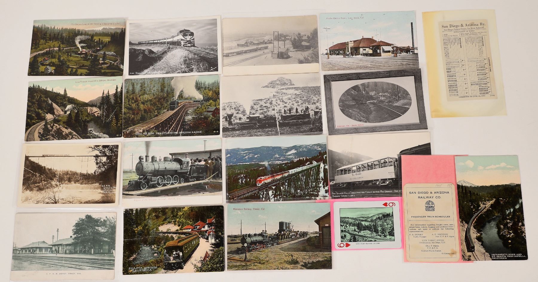 Lot of 19. one Sepia Chrome Series, three RPC's. Postmarks : Sacto-San Fran R.P.O., Surrey Ca cir. 1908 ( just a whistle stop then), one card has an uncalcelled 1 cent Wash stamp. Street level views : Silver Vista Coach Car on the Rio Grande, Shasta Retreat Dunsmuir, Long Beach Pacific Electric depot, Shasta Springs depot, Dollar Hide Trestle, Alaska RR Streamliner, S.P.R.R.depot Tracey Cal (1906 cir), N.C. R.R. 109 ft high trestle. Birdseye : Tunnels Siskiyou Mtns, Cantara loop Sacramento river, Calif.. Zephyr crossing Feather River trestle, Loco Jupiter pulling Gov. Stanford of Utah train to Golden Spike ceremony, Surrey Cal. 1906 era as small RR stop and layover. California 1906-50's Ken Prag Collection