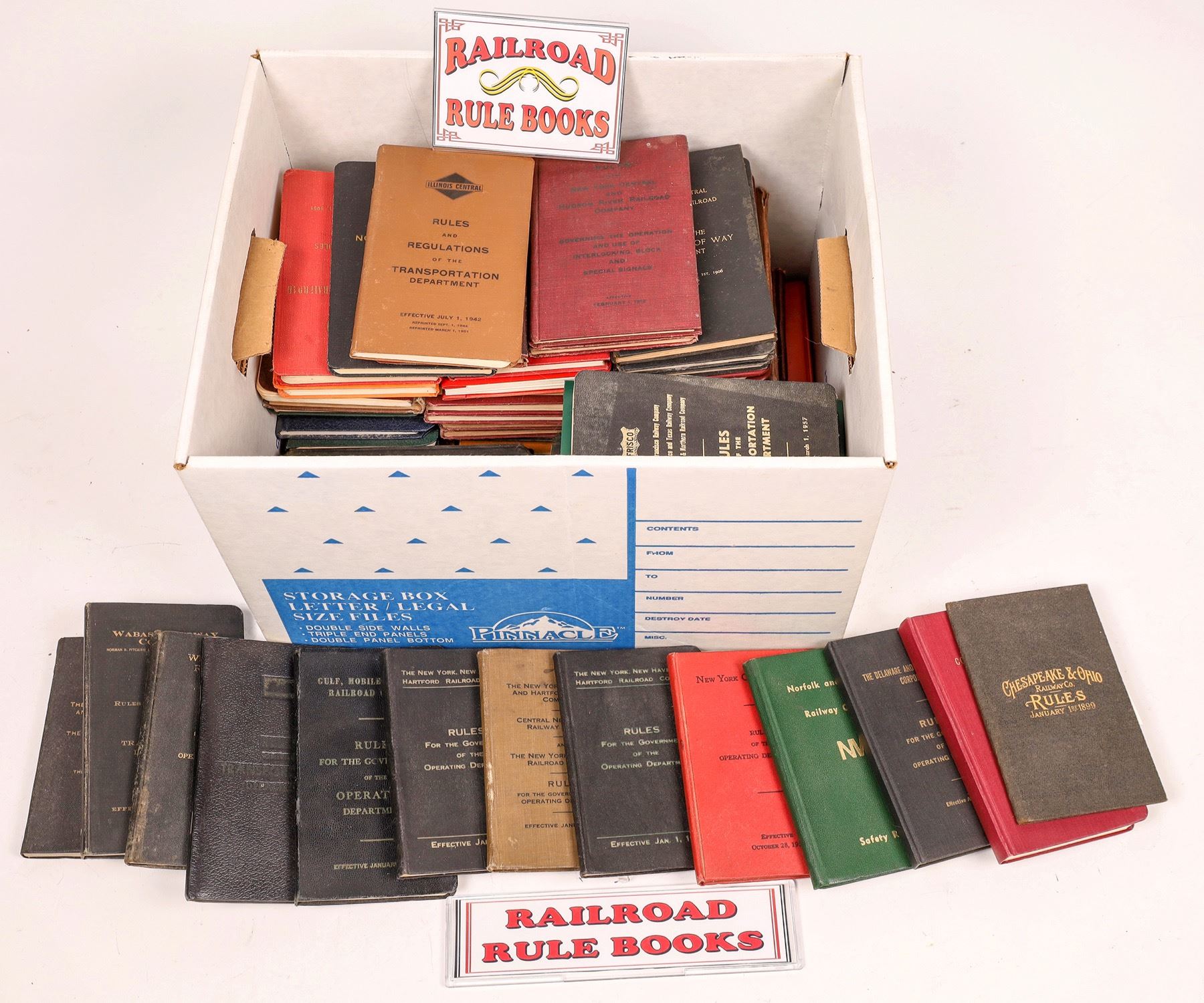 about 84 railroad rule books from across America. Date from the 1890s, ches & Ohio to more recent such as Gulf Mobile and Ohio. The standard format is about 4x6 inches, just the right size for the conductor's pocket. This collections took decades to assemble and is worthy of any major collection or reference library