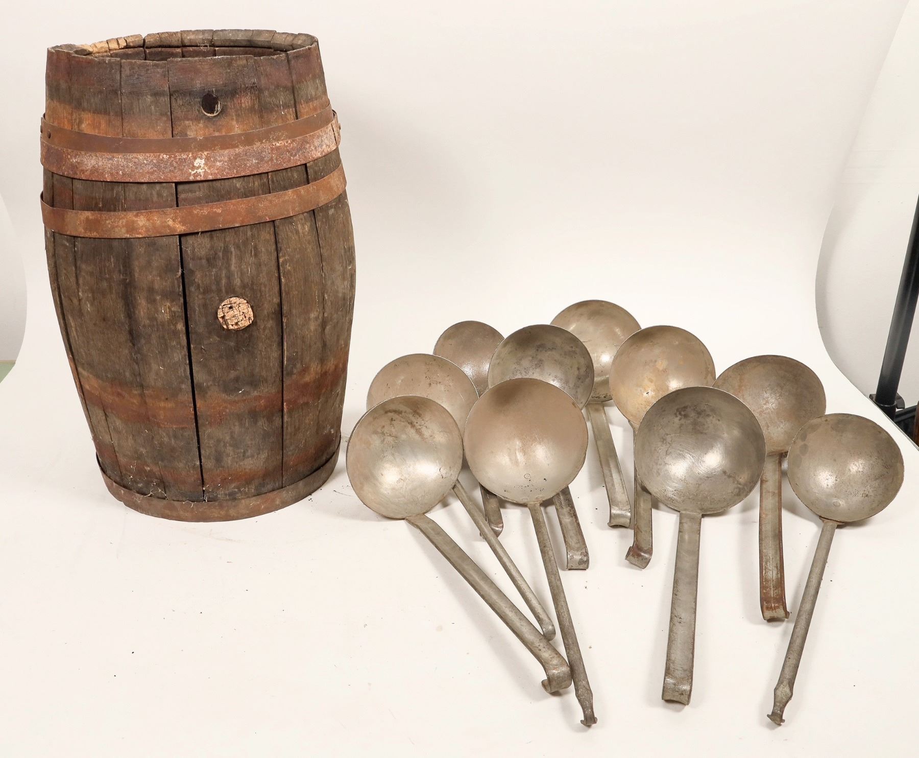 Railroad siding water barrel and nine water ladles. Barrel measures 12"x 22" and the staves have shrunk, so this is more geared towards decorative use than practical. The ladles, measuring about 19" are another story. They are all in nice condition and ready for use. Please see photos for more details.