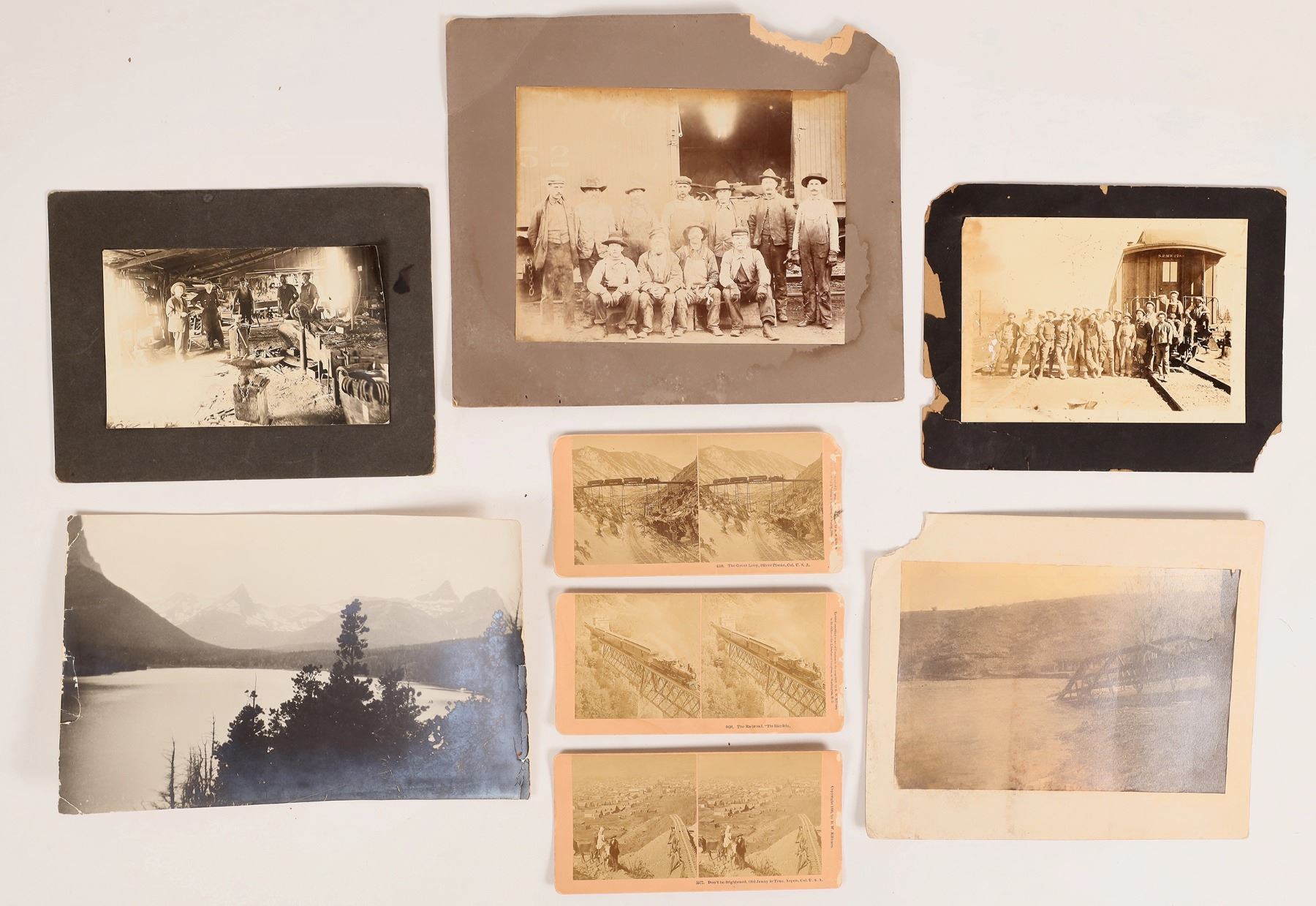 3 Colorado railroad stereoviews. 5 bigger photos of railroad workers near caboose and box car, collapsed bridge, 1932 Glacier Park lake.