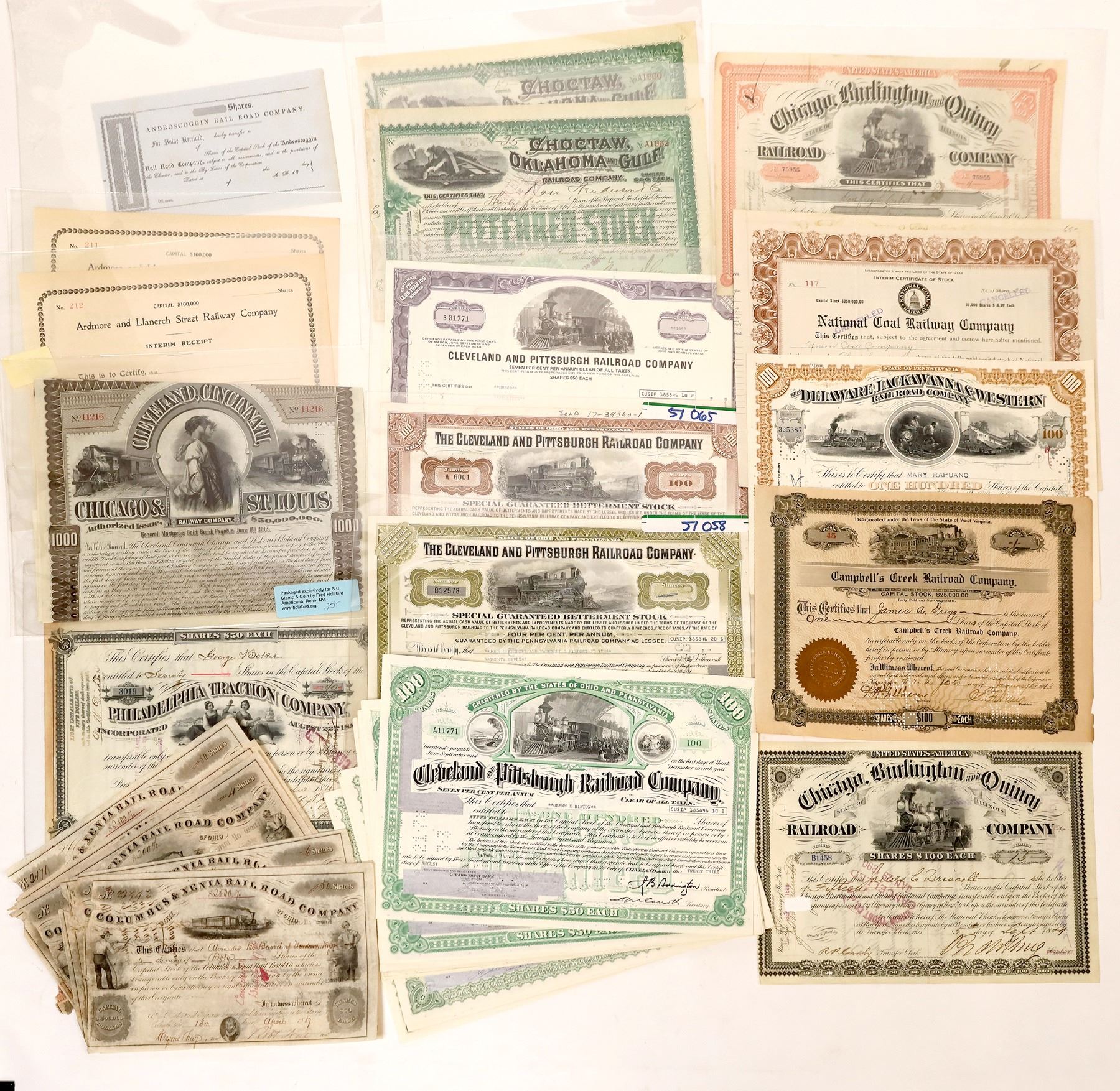 Lot of 37. Mix of issued and unissued. Includes: Campbell's Creek Railroad Co. (1913 stock); Delaware, Lackawanna & Western Railroad (1958 stock); National Coal Railway Co. (1927 stock); Chicago, Burlington & Quincy Railroad (1889 and 1901 stocks); Columbus & Xenia Railroad (10 stocks issued in the 1850s and 60s); Cleveland & Pittsburgh Railroad (15 stocks issued in the 1970s); Choctaw, Oklahoma & Gulf Railroad (two 1899 stocks); Philadelphia Traction Co. (1891 stock); Cleveland, Cincinnati, Chicago, & St. Louis Railway ($1,000 bond, 1893); and 3 unissued stocks. Please inspect.