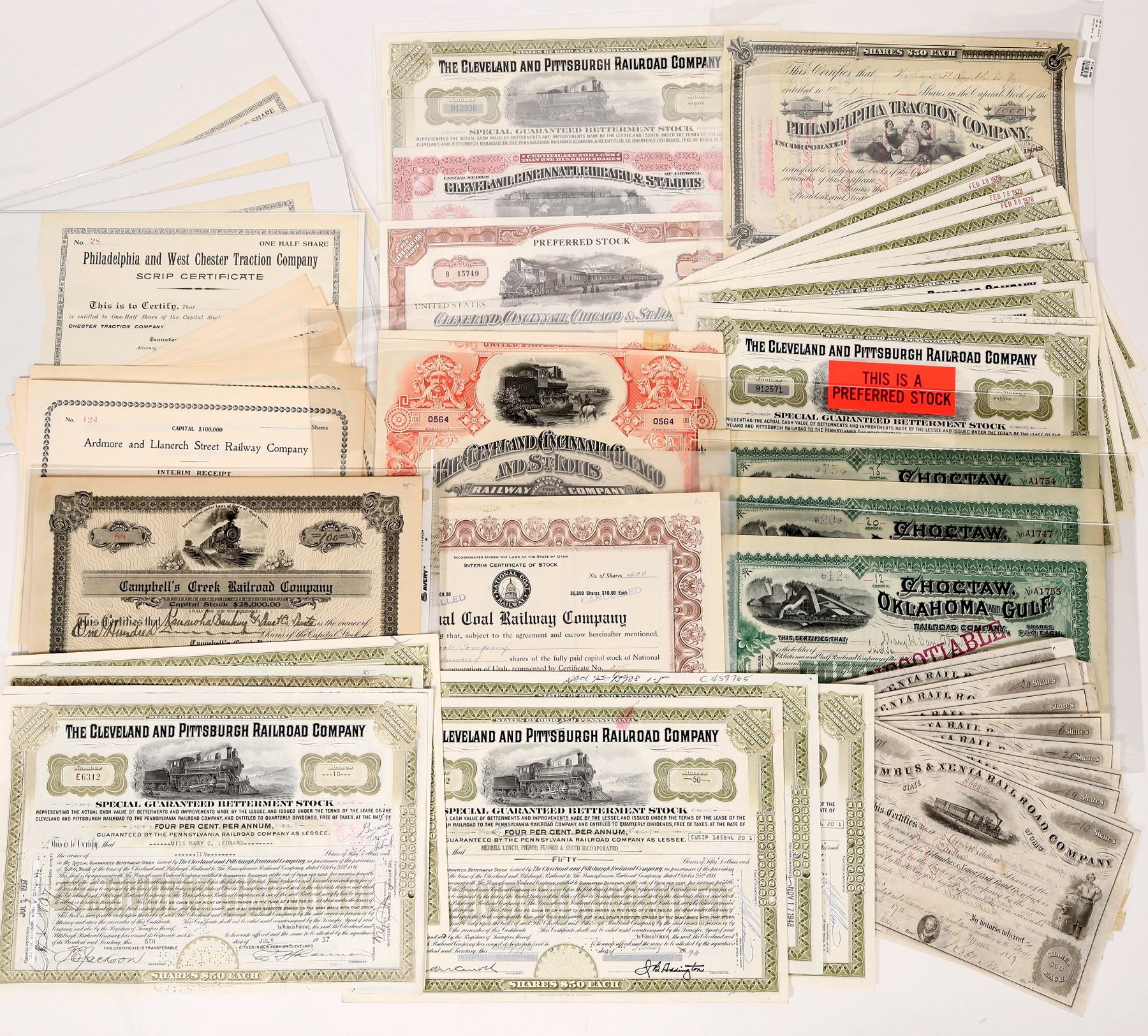Lot of 52. Includes: Columbus & Xenia Railroad Company (10 stocks issued in the 1850s); Philadelphia Traction Co. (1883 stock); Cleveland, Cincinnati, Chicago & St. Louis Railway Company (two different stocks, 1970s, and an 1891 $500 bond); Philadelphia & West Chester Traction Co. (5 unused scrip certificates); Ardmore & Llanerch Street Railway Co. (8 unused interim receipts, 1901); Cleveland & Pittsburgh Railroad Co. (20 stocks, issued 1916-1978); Choctaw, Oklahoma & Gulf Railroad Co. (3 stocks issued in 1898); National Coal Railway Co. (1927 stock); and Campbell's Creek Railroad Co. (1928 stock). Please inspect.