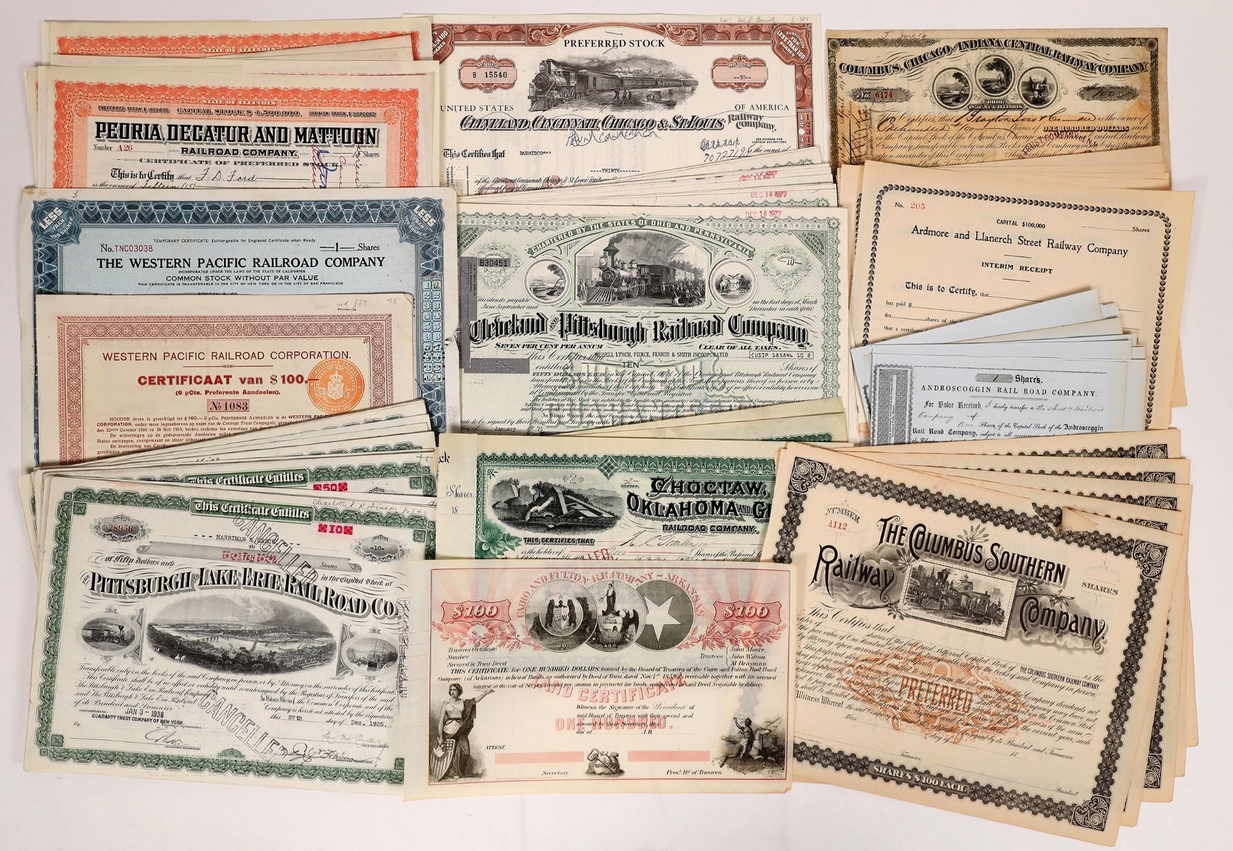Lot of 85. Mix of issued and unissued. Includes: Cairo & Fulton RR. Company (unused $100 Land Certificate); Peoria, Decatur & Mattoon Railroad Co. (5 stocks, 1904-05); Ardmore & Llanerch Street Railway Co. (5 unused interim receipts, 1901); Columbus, Chicago & Indiana Central Railway Co. (1873 stock); Androscoggin Rail Road Co. (21 stocks, 1 issued in 1858, the rest unissued); Cleveland & Pittsburgh Railroad Co. (21 stocks issued in the 1970s); Cleveland, Cincinnati, Chicago & St. Louis Railway (1972 stock); Columbus Southern Railway Co. (5 unissued stocks); Choctaw, Oklahoma & Gulf Railroad Co. (5 stocks issued in 1898); Pittsburgh & Lake Erie Railroad Co. (22 stocks issued in the 1930s); and Western Pacific Railroad Corp. (1925 foreign stock and 1945 stock). Please inspect.