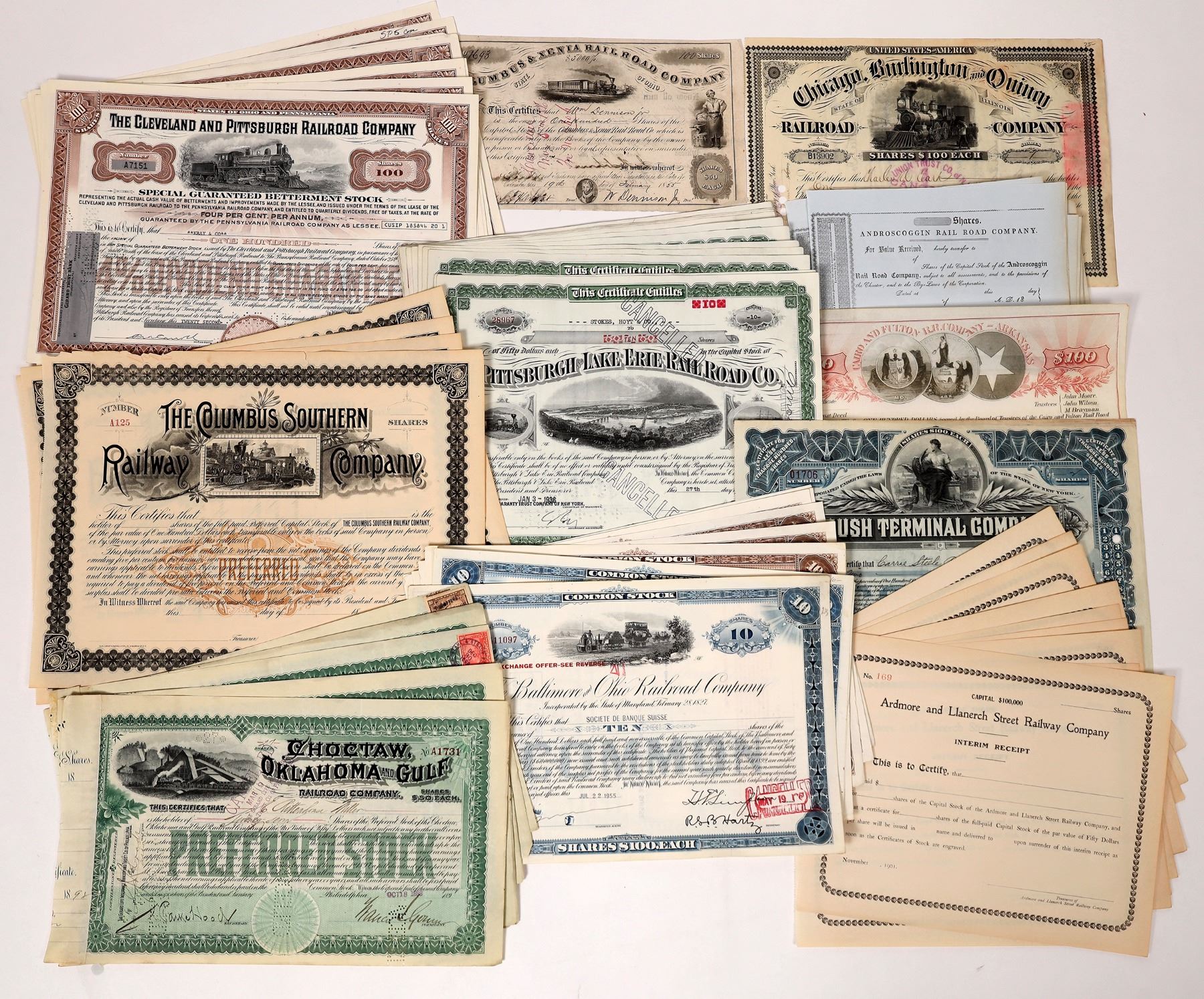 Lot of approx. 89. Mix of unissued and issued. Includes: Columbia & Xenia Railroad Co. (1855 stock); Choctaw, Oklahoma & Gulf Railroad (6 stocks issued in 1898); Baltimore & Ohio Railroad (10 stocks, two varieties, issued in the 1950s); Ardmore & Llanerch Street Railway Co. (15 unused interim receipts, 1901); Bush Terminal Company (1921 stock); Columbus Southern Railway Co. (4 unissued 1800s stocks); Pittsburgh & Lake Erie Railroad Co. (20 stocks issued in the 1930s); Cairo & Fulton Railroad Co. (unused $100 Land Certificate); Cleveland & Pittsburgh Railroad Co. (10 stocks issued in the 1970s); Chicago, Burlington & Quincy Railroad (1894 stock); and Androscoggin Rail Road Co. (20 unissued stocks, c.1850s). Please inspect.