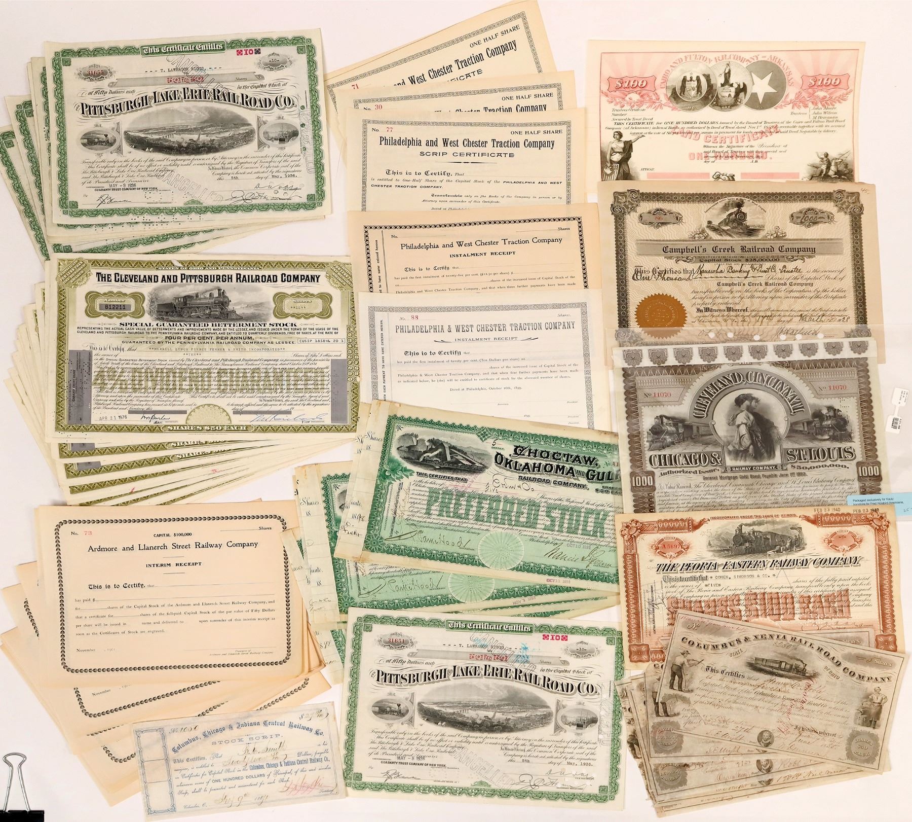 Lot of 62. Mix of issued and unissued. Includes: Columbus & Xenia Railroad Co. (5 stocks issued in the 1850s); Columbus, Chicago & Indiana Central Railway Co. (stock scrip 1871); Philadelphia & West Chester Traction Co. (5 unissued pieces); Cairo & Fulton Railroad (uniss. $100 Land Certificate); Ardmore & Llanerch Street Railway (15 unused interim receipts, 1901); Cleveland, Cincinnati, Chicago & St. Louis Railway ($1,000 bond, 1893); Pittsburgh & Lake Erie Railroad (7 stocks issued in the 1930s); Choctaw, Oklahoma & Gulf Railroad (5 stocks issued in 1898); Campbell's Creek Railroad (1928 stock); Peoria & Eastern Railway (1937 stock); and Cleveland & Pittsburgh Railroad (20 stocks issued in the 1970s). Please inspect.