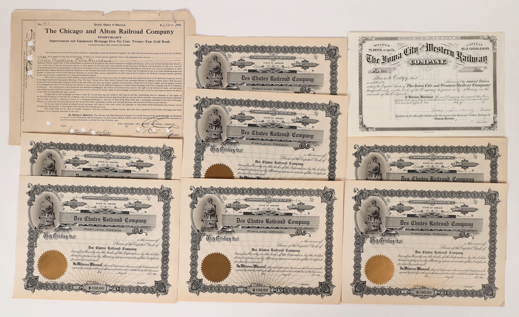 Railroad stock certificates, including seven (7) blank certs for The De Chutes Railroad Company of Oregon. Also included is a cancelled cert for The Chicago and Alton Railroad Company and a blank cert for The Iowa City and Western Railway. All are in decent condition (Brand New). Please see photos for more detail. 1900s