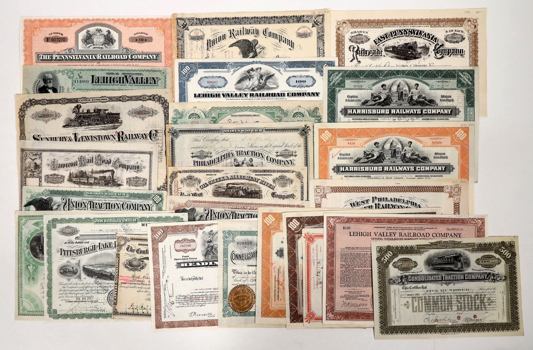 24 different railroad stocks, c. about 1882-1960, mostly older. Consolidated traction, Sunbury & Lewiston, Lawrence Rail Road, Lehigh Valley, Reading, Lehigh & Mahanoy, Union Traction of Philadelphia etc. See photo.