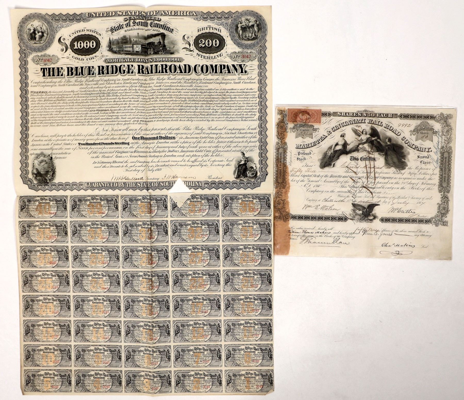1869 $1000 Blue Ridge Railroad bond with all coupons. Issued 1867 Marietta & Cincinnati Rail Road stock with adhesive RN and left side adhesive residue.