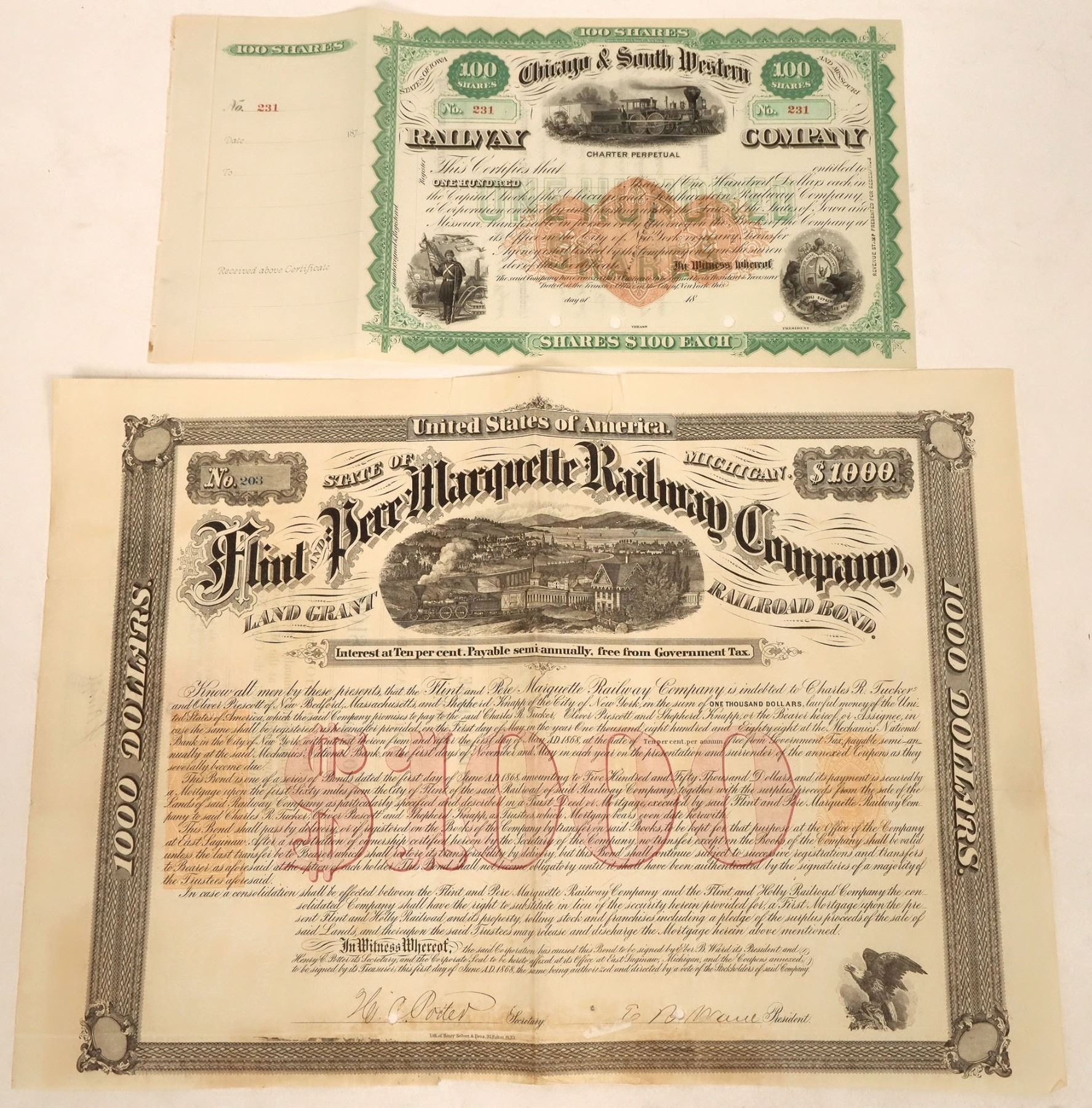 Unissued Chicago & South Western Railway stock with imprinted RN U. 1868 Flint and Pere Marquette Railway bond with imprinted RN W and RN P on front, RN P on verso. Multiple cancel tears, bottom toning.
