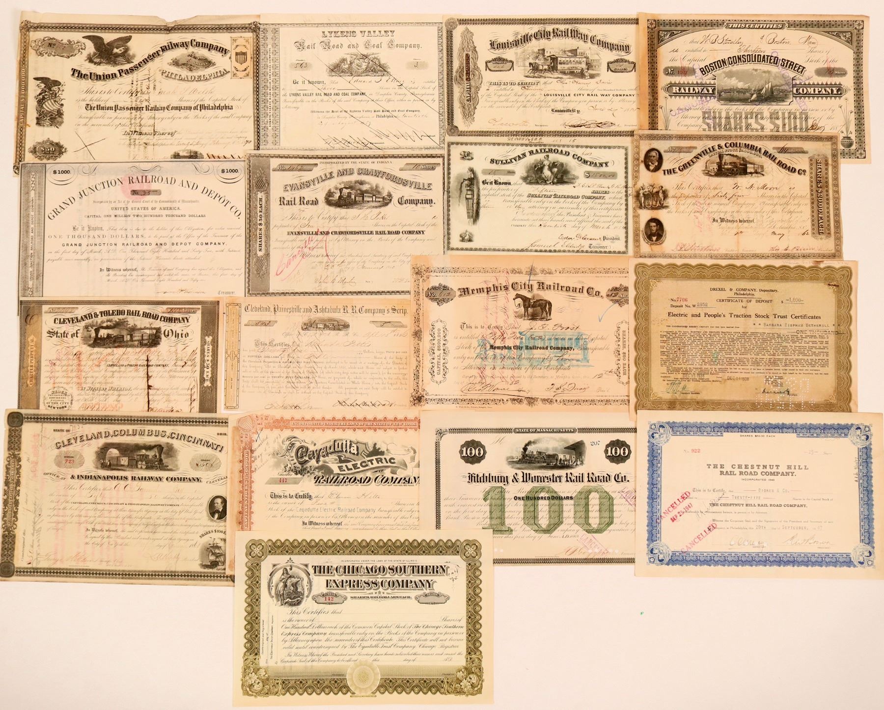 This is a collection of Railroad stocks dating from the 1850's to 1947 with one stock never issued. All beautifully detailed with vignettes. One issued during the civil war; seventeen stocks in all. Please see photos for details.