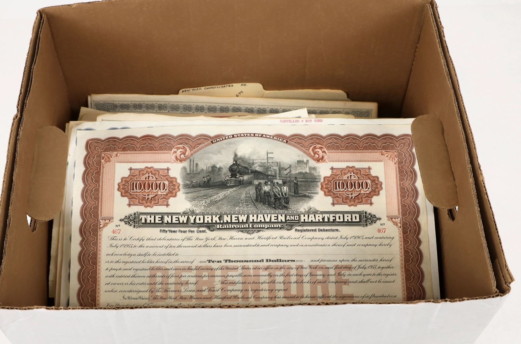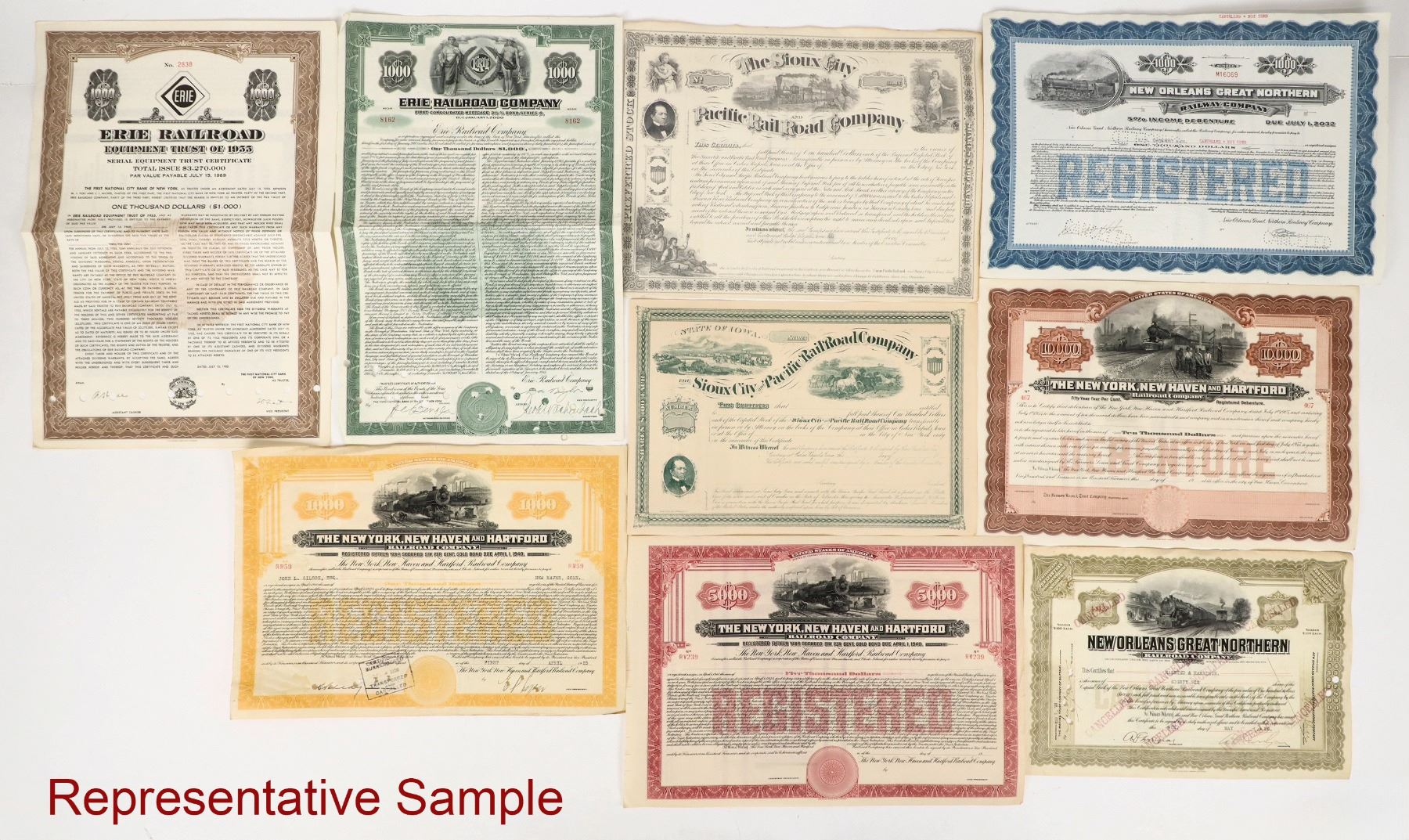 Railroad Stocks/Bonds Mixed Box Lot : New York Consolidated Railroad Company (14), all signed and all cancelled, 5 signed, unissued, cancelled c.1916; Erie Railroad Equipment Trust of 1955 (130); Erie Railroad Company Bonds New York 1945 (17); Metropolitan Cross-Town Railway Company First Mortgage $1000 Bonds 1920, issued not cancelled (36); Sioux City and Pacific Railroad Company Stocks (18) unissued; New York, New Haven and Hartford Railroad Company 1900s, Variety of Debenture, Registered, Common, Preferred, different colors and sizes, most issued and cancelled, a few unissued (200); New York Railways Corp 1926 (54); New Orleans Great Northern Railway Company 5% Bonds and Stock Certs (150)