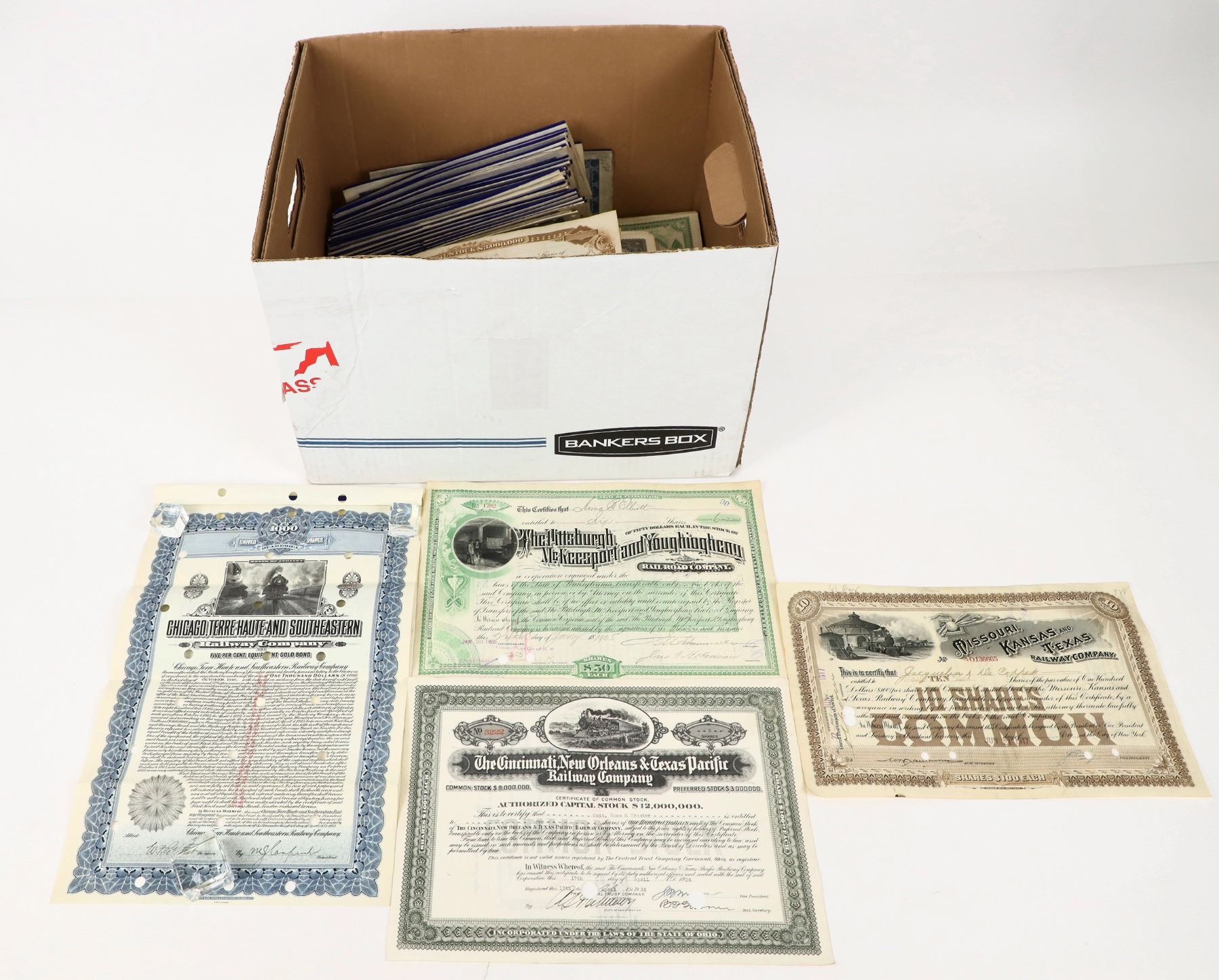 Chicago, Terre Haute and Southeaster Railway Company $1000 Bonds, blue, about 75, c.1920s; Pittsburgh McKeesport and Youghiogheny Railroad Company Stocks, green about 200, c.1890s-1920; The Cincinnati, New Orleans & Texas Pacific Railway Company, 2 varieties, about 200 c. 1920s, The Missouri, Kansas and Texas Railway Company, 200.