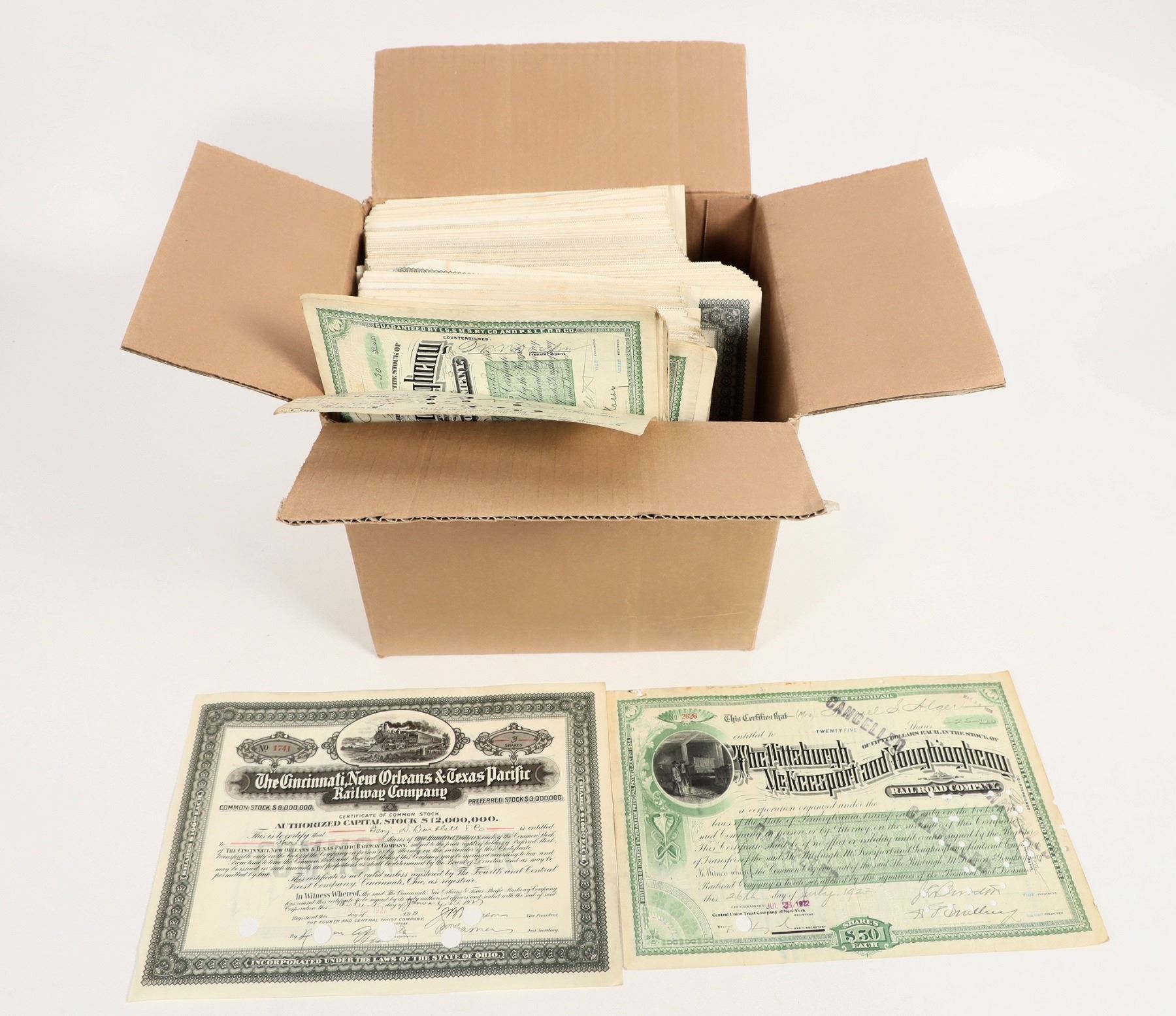 Pittsburgh McKeesport and Youghiogheny Railroad Company Stocks, green about 200, c.1890s-1920; The Cincinnati, New Orleans & Texas Pacific Railway Company, about 600 c. 1920s.