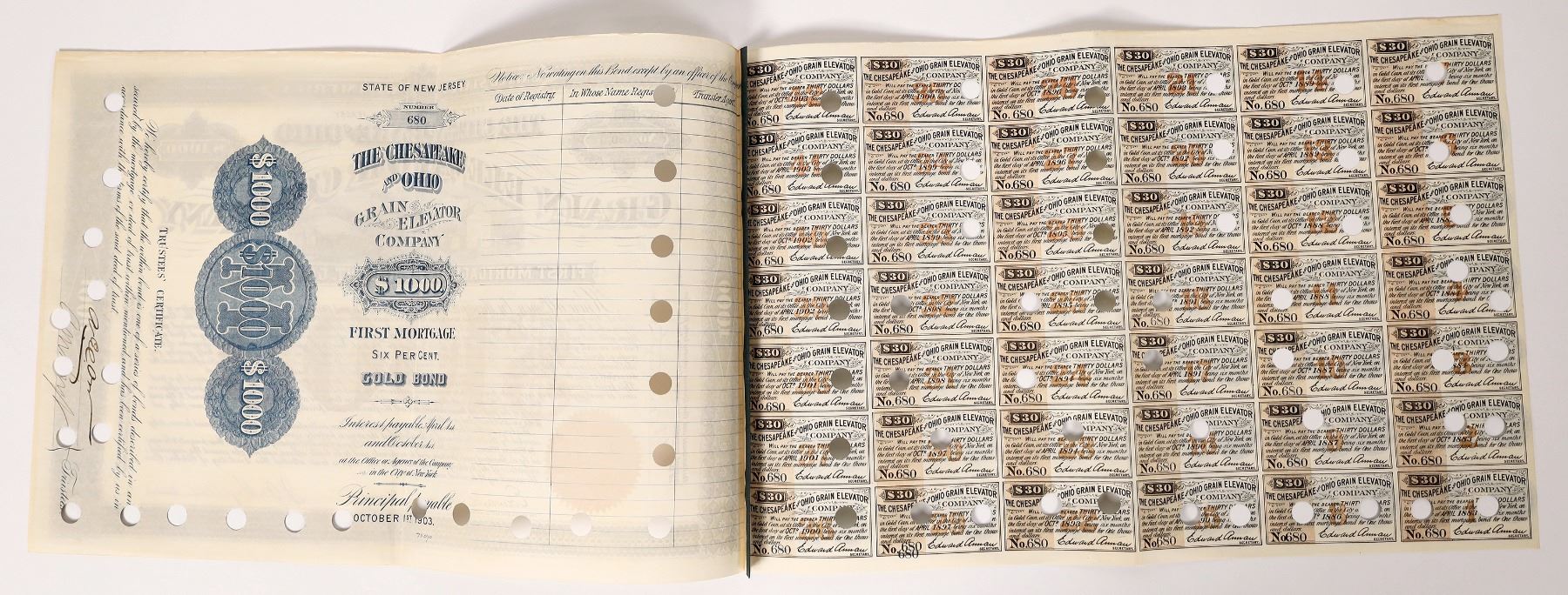 Lot of 3 different. All have the signature of Collis P. Huntington, one of the "Big Four" founders of the Central Pacific Railroad. 1) Short Route Railway Transfer Company of Lousiville, Kentucky. Stock issued in 1886. Signed by Huntington as president. Signature is heavily punch cancelled. Railroad vignette. 2) Chesapeake, Ohio, & Southwestern Railroad Company. 1880s stock that is unissued but signed by Huntington as president. His signature is pen cancelled. Railroad vignette. 3) Chesapeake & Ohio Grain Elevator Company $1,000 bond issued in 1882. Signed on the left side by Huntington for the Chesapeake & Ohio Railway. Signature is punch cancelled.