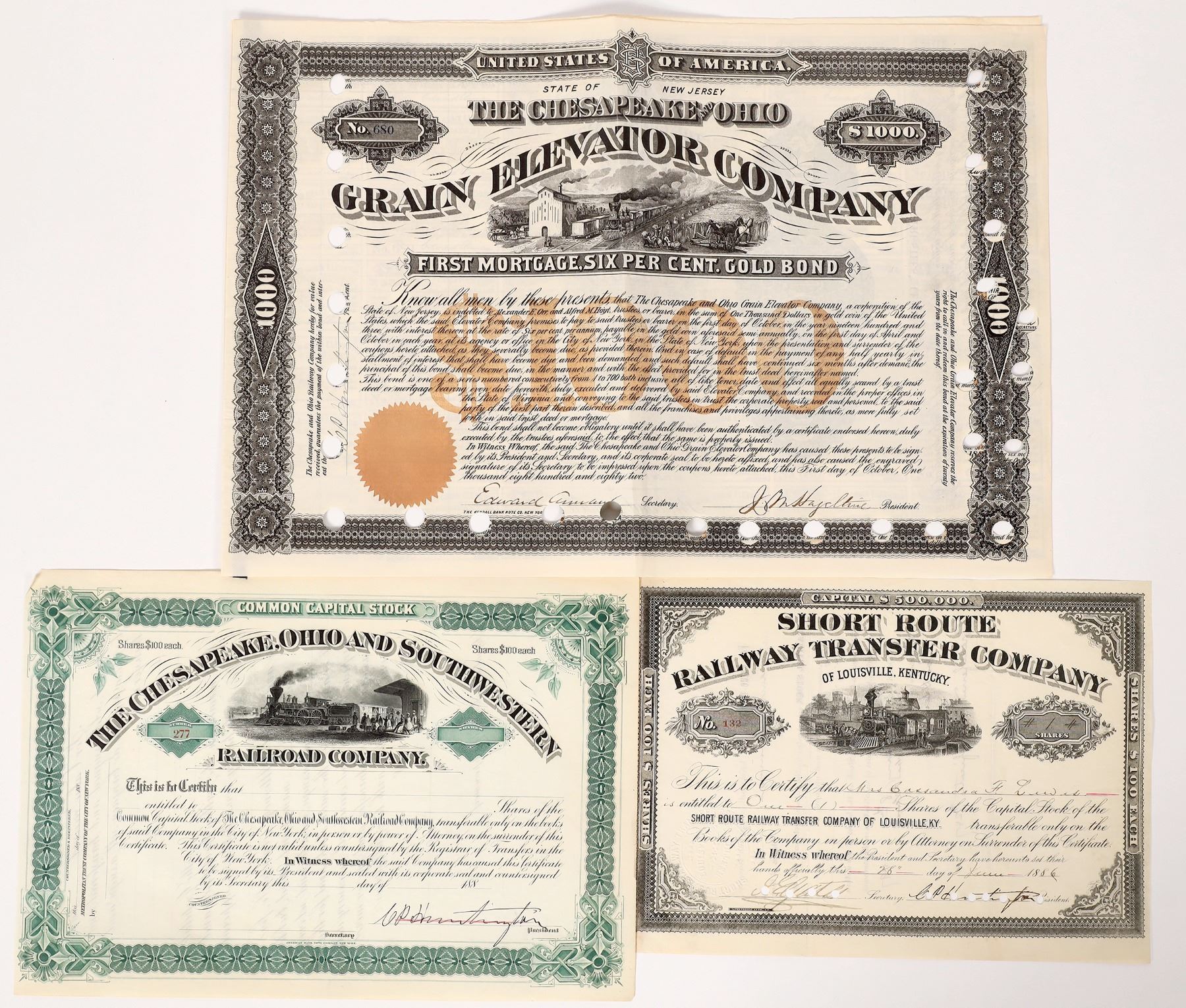 Lot of 3 different. All have the signature of Collis P. Huntington, one of the "Big Four" founders of the Central Pacific Railroad. 1) Short Route Railway Transfer Company of Louisville, Kentucky. Stock issued in 1886. Signed by Huntington as president. Signature is heavily punch cancelled. Railroad vignette. 2) Chesapeake, Ohio, & Southwestern Railroad Company. 1880s stock that is unissued but signed by Huntington as president. His signature is pen cancelled. Railroad vignette. 3) Chesapeake & Ohio Grain Elevator Company $1,000 bond issued in 1882. Signed on the left side by Huntington for the Chesapeake & Ohio Railway. Signature is punch cancelled.
