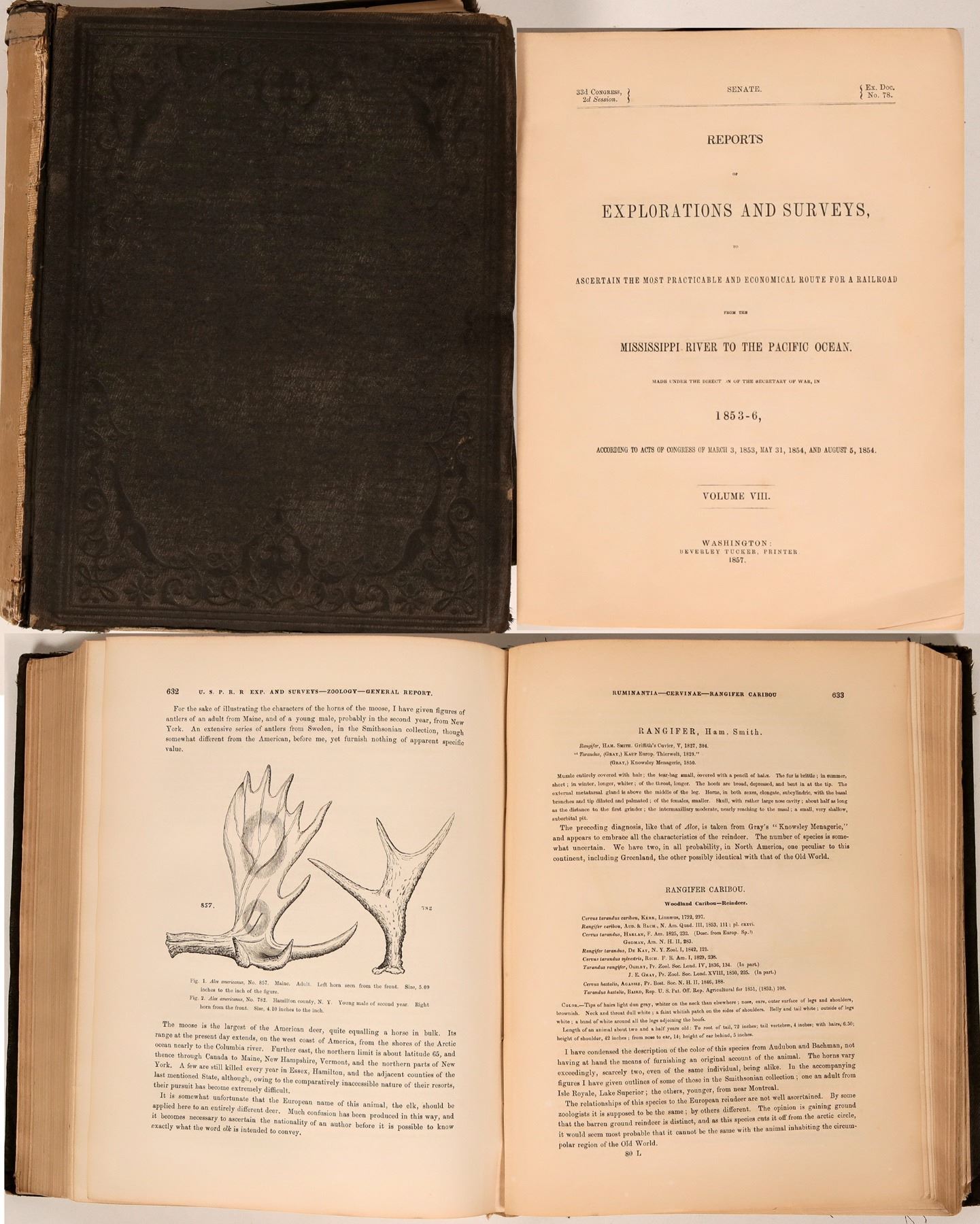 Lot of 1. General Report upon The Zoology of the Several Pacific Railroad Routes, Washington D.C. 1857. This volume has been devoted to animals, comes with plates of mammals etc. In the 1850s, extensive surveys were conducted by the U.S. Army to ascertain the best route for a railroad from the Mississippi River to the Pacific Coast.