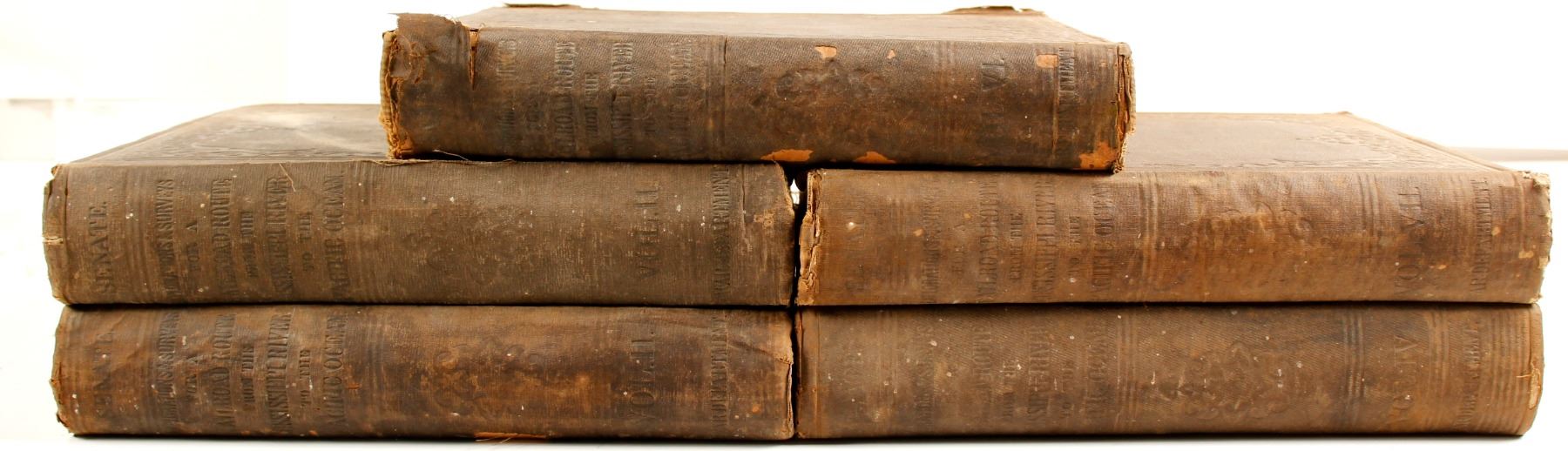 Only five volumes of this essential historical set. Reports on Explorations and surveys to ascertain the most practical and economic route for a railroad from the Mississippi River to the Pacific Ocean, 1853-6. Washington. Beverly Tucker, 1857. This group has Vol 7, San Francisco Bay to Los Angeles, California west of the Coast Range and the Pimas Villages from the Gila to the Rio Grande... by Parke, 1854-5; vol 6, Sacramento Valley to the Columbia River by Williamson, 1855; Vol 4, Botany of the Expedition, 1856; vol 3, Reports of Whipple; vol ?, Ft. Leavenworth West..., title page missing, fist few pages adhered together from water damage. All volumes water damaged to the exterior, and some staining interior. Most prints still fine. No illustrations removed. City: State: Date: HWAC# 81156